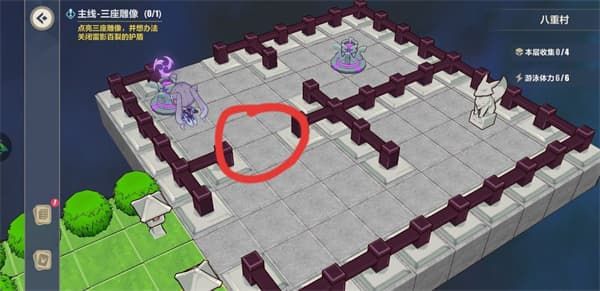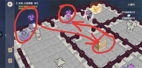 首先,离开地图,从上面的红色圆圈中取出力量,放入右边的雕像中。点亮后,将电源放回原处(实际上你应该随身携带)。