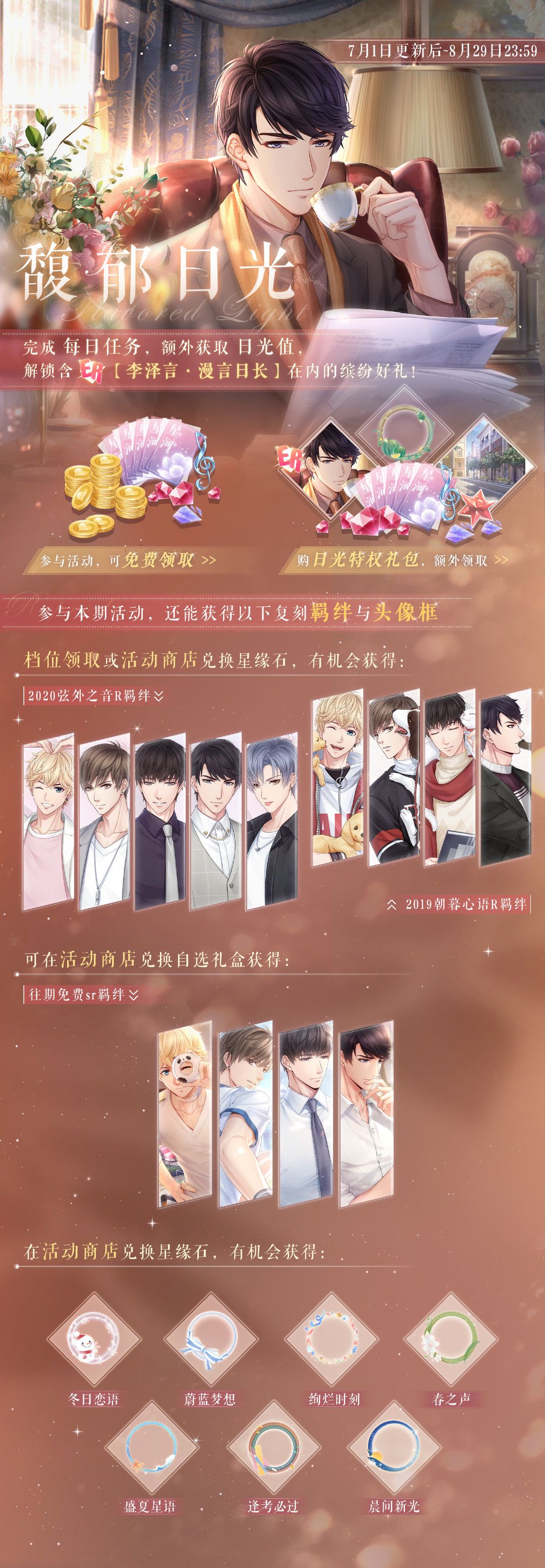 这一轮【充实阳光】活动的ER奖项都是以“午后时光”为主题。在这个活动中,制作人可以升级白昼特权,获得额外的er【李泽言,闫妍,龙天】。