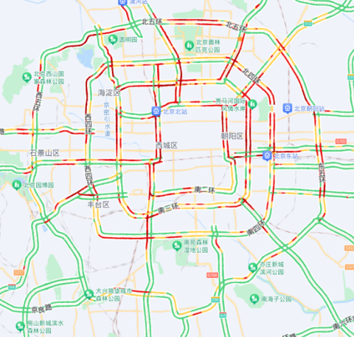 城区主要环路部分路段,菜户营南路、阜石路、通惠河北路、西直门北大街、万泉河路等联络线以及京藏、京承、京港澳、京开、首都机场高速、京通快速路等主要高速公路“早进晚出”潮汐车流明显,局部路段压力集中。