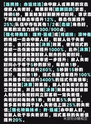 其次,提高最终攻击技能的专业和最终攻击技能乘数。基本比率增加了1000。在此基础上,它是根据剩余不平衡时间进一步计算的。低于五秒钟的零件每秒增加285,总增加1400;从五秒到15秒的零件将增加每秒100,总数增加了1000的技能比。当不平衡时间持续15秒时,技能乘数可以达到上限,总增加了3400。此外,将这种放大效果添加到原始放大倍数中,并将损坏显示为角度计算。