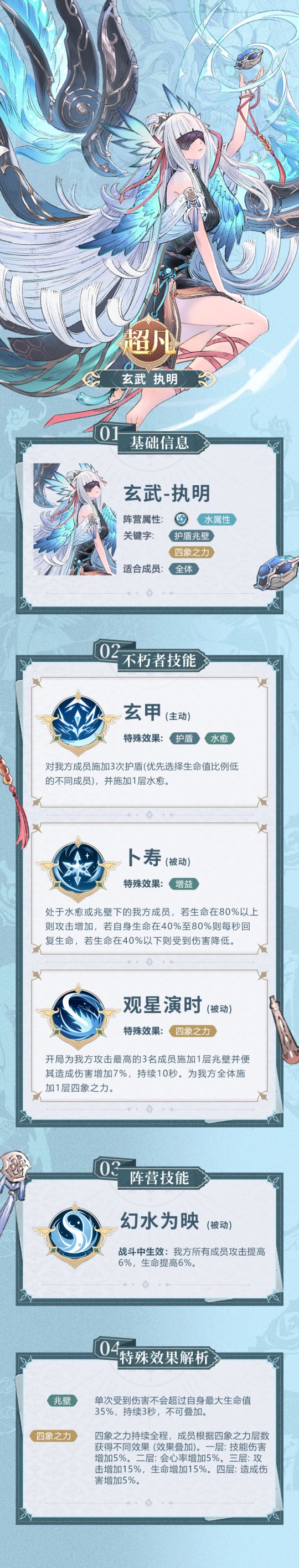 在战斗中,玄武还会对我方所有成员施加一层四像,提供战场增益,并且还会与其他神仙产生联动效果。