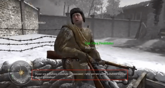 但是玩家@ghostdotmidi,爆发土豆“可能是向教程中的《使命召唤2》经典场景——致敬,当您接近一盒土豆时,士兵会触发互动,并说:“这些政治委员会,这些是土豆——,我们为什么要使用土豆,而不是真正的grodess,而不是真正的gro虫?透明