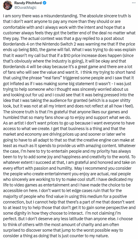 实际背景是:有人在约《无主之地4》登录Nintendo Switch 2的帖子中回应了我,警告说,如果价格最终为80美元,游戏将会失败。当时我想解释的是,这不是我可以决定的,但是如果确实发生了10美元的价格(因为这显然是行业的趋势),情况不会产生很大的影响,而《无主之地4》的影响也不错,因为这是一场很棒的游戏,并且有很多粉丝可以看到它的价值并想要它。