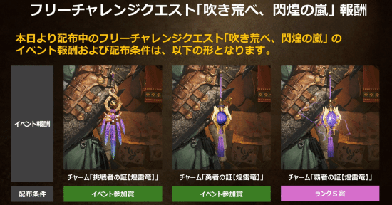 就在今天,《怪物猎人:荒野》正式宣布,以前的免费挑战任务“愤怒的凶猛!风暴风暴”的奖励已经发布!只要参加挑战任务的球员就可以获得“挑战者证书[Sheng Thunder Dragon]”和“证书[Sheng Thunder Dragon]”。获得评级的玩家可以获得——“霸王证书[Sheng Lei Dragon]”的独家奖励! (中文A评级对应于日本的评级,b评级对应于日本评级)