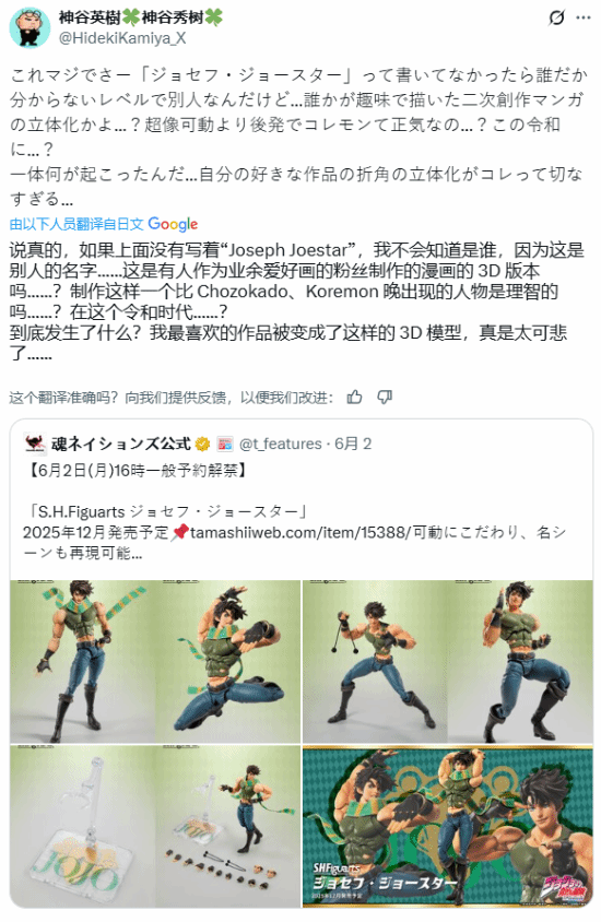 Kamiya Hideki最近愤怒地炸毁了由Bandai Soul在社交媒体上推出的《JOJO的奇妙冒险》 Joseph Josda的人物,并认为其形象与漫画的形象大不相同。