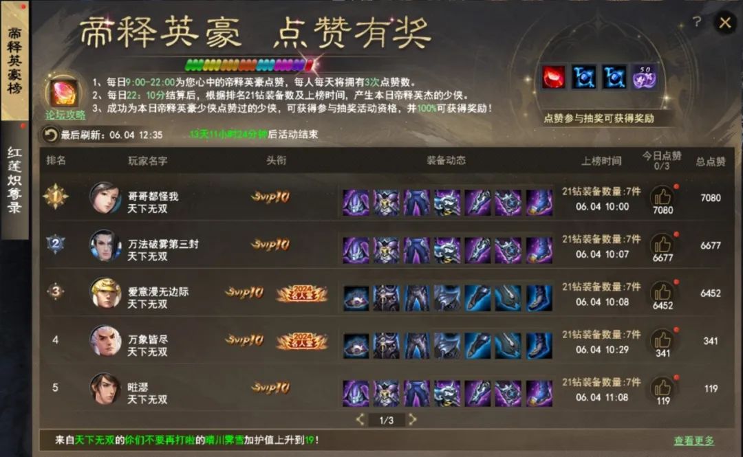每日9:00-22:00。当前角色保护总数144的年轻英雄可以分别喜欢Indra Hero榜单上的年轻英雄和Honglian Chi Zun记录。每天的每个列表上都有3个喜欢的机会。
