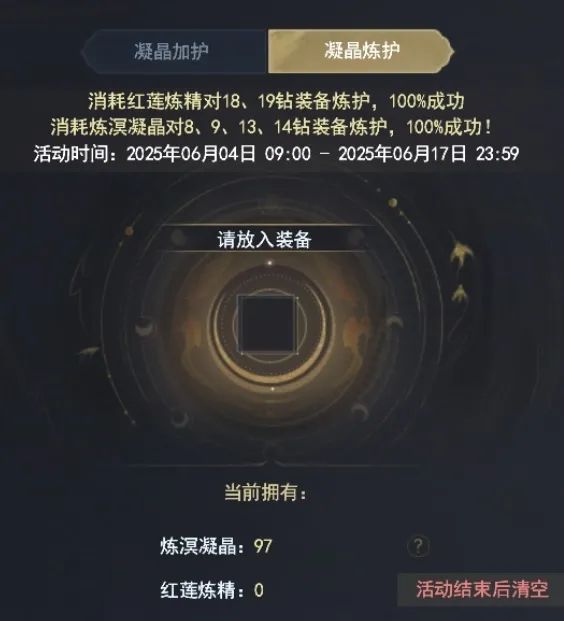 在活动界面中,它分为两个主要功能:晶体内聚和晶体内聚会以及晶体内聚和精炼。年轻的英雄可以根据自己的需求加强或完善设备自己切换页面。将设备放在背包中,您可以继续执行相关操作!