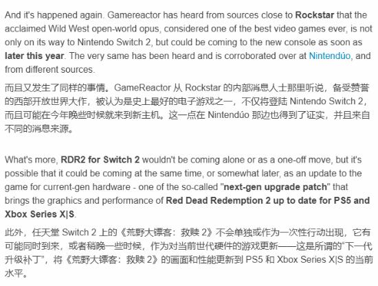著名的内部人内特(Nate)仇恨还在最新的播客剧集中证实了这一消息,他说:“关于这些谣言,我只想说这个新闻是真实的。《荒野大镖客:救赎2》将被登录到Switch 2,还将为PS5/Xbox系列X版本启动升级补丁。”