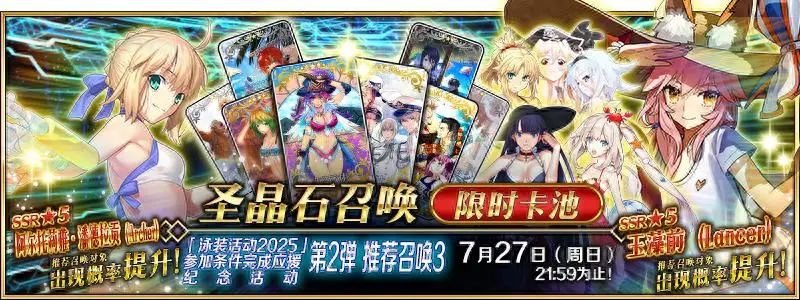 为了纪念计划于2025年8月中旬开放的“泳装事件2025”,建议召唤6个骑手,两种类型的召唤卡打开!此外,将建议在“泳装活动”中出现的六个限时概念服装召唤!