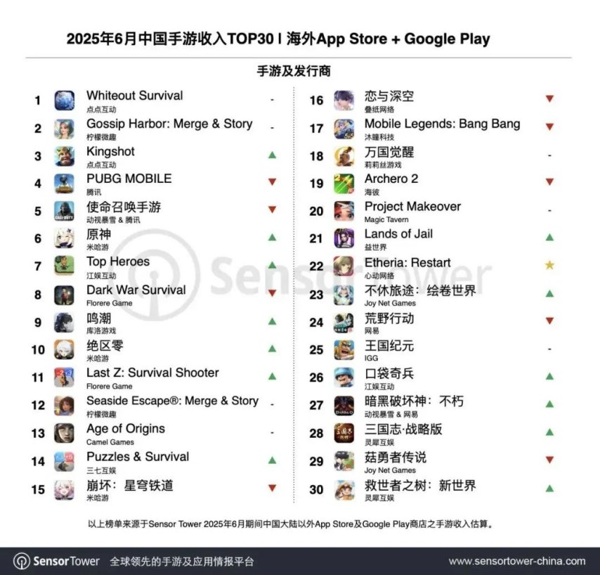 2025年6月,传感器塔数据发布。在中国手机游戏的前30名海外收入清单中,熟悉的名字正在“战斗”,新面孔也在出现。