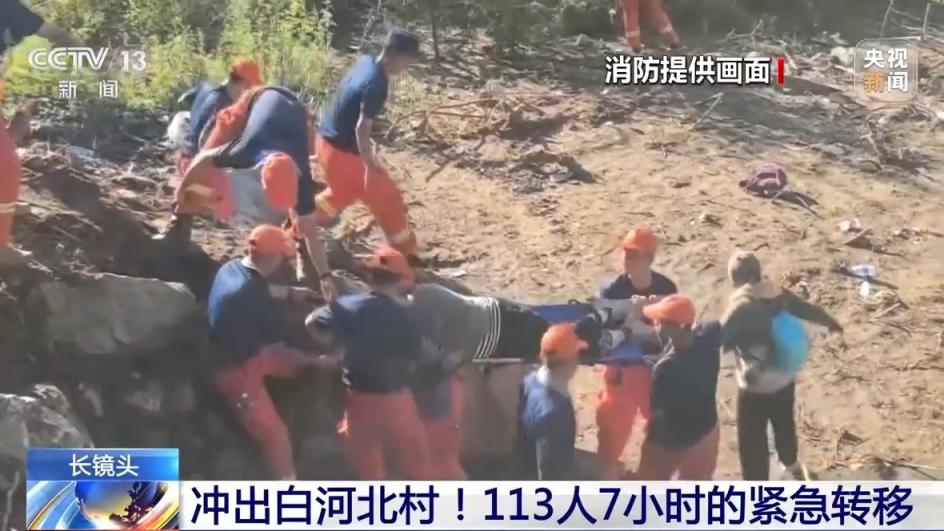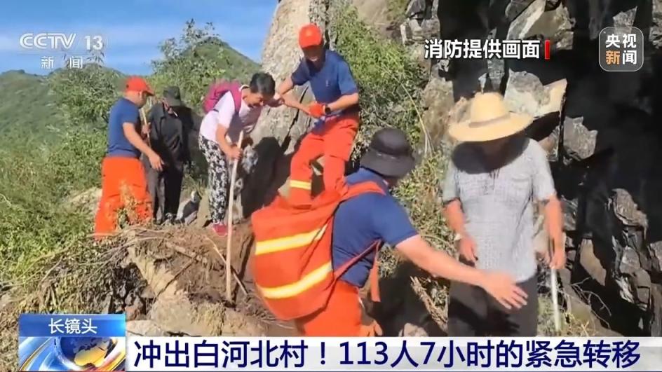 近日,在北京怀柔区琉璃庙镇,被困白河北村的100多名群众需要转移出山,其中有一些老人行动不便,消防人员一路翻山越岭,历经7小时,终于将他们平安转移至安置点。