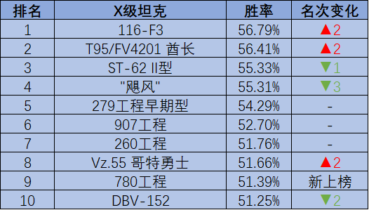 X级坦克的获胜率清单上的坦克相对稳定,本周116-F3的获胜率表现良好,其排名略有上升。但是,作为具有“独特特征”和明显缺陷的特殊坦克,116-F3可以赢得如此高的获胜率,这真是太神奇了。仍然有许多汽车队长独自一人爱这个坦克。