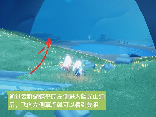 1.玩家穿过叶韵蝴蝶平原,从左边进入幽光山洞穴后,可以飞到左边的草坪去见他们的祖先。