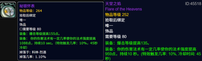 Mirsilian Pocket Watch,264座居民的属性为155个关键命中水平,特殊效果为1088咒语强度,持续10秒钟。