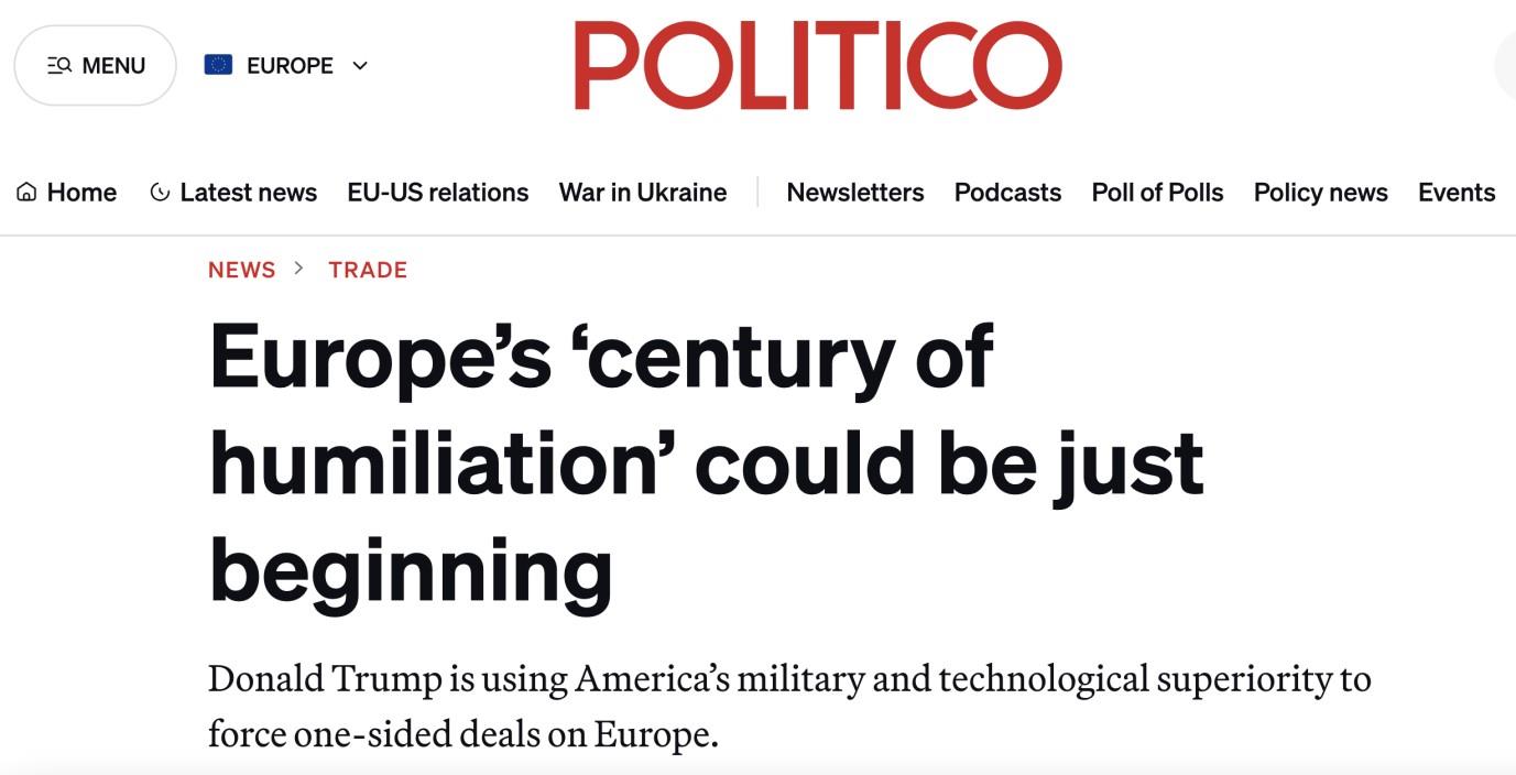 尽管欧盟委员会发言人葆拉·皮尼奥本周早些时候就捍卫欧盟制定和执行自身技术规则的权利进行了发声,表示“监管欧洲范围内经济活动是欧盟及其成员国权利”。但是《政治报》欧洲版日前撰文指出,面对欧美贸易新协议的不平等条款和特朗普政府不断升级的威胁,欧洲的“百年屈辱”或许才刚刚开始。