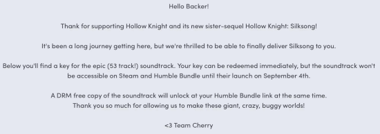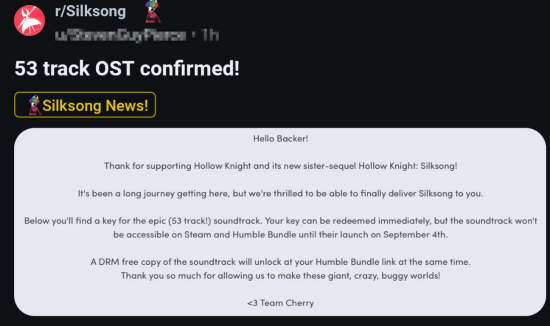 根据Twitter Blogger @Daily Silksong News的报道,一名众筹玩家最近收到了Cherry Team官方官员的电子邮件,确认《丝之歌》游戏配乐将包含53条曲目!