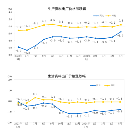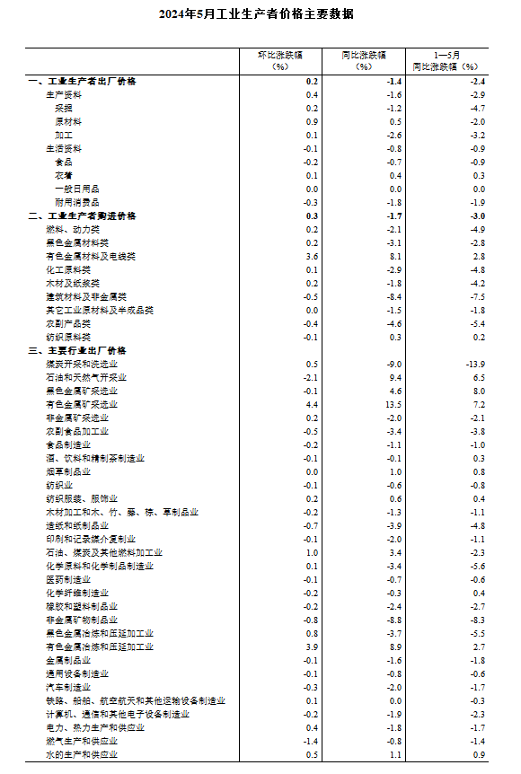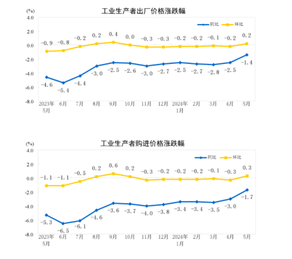 2024年5月份,全国工业生产者出厂价格同比下降1.4%,降幅比上月收窄1.1个百分点,环比上涨0.2%,上月为下降0.2%;工业生产者购进价格同比下降1.7%,环比上涨0.3%。1—5月平均,工业生产者出厂价格比上年同期下降2.4%,工业生产者购进价格下降3.0%。