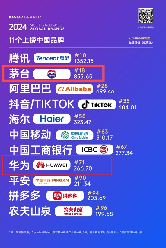 17、Runer开挂辅助 6月12日,凯度集团最新发布2024年凯度BrandZ最具价值全球品牌100强榜单及分析报告,中国11个品牌上榜。贵州茅台以855.65亿美元的品牌价值首次跃升中国品牌第2名,总榜第18名,连续第七年位居全球酒类品牌价值榜首,也是100强榜单中唯一的中国酒类品牌。 在100强上榜的11家中国品牌中,茅台位列第2,排名腾讯之后,后8位分别是阿里巴巴、抖音/TIKTOK、海尔、中国移动、中国工商银行、华为、平安、拼多多、农夫山泉。与2023年的14家上榜企业相比,2024年中国上榜企业减少了3个。 其中华为的品牌价值是226.70亿美元,位列中国品牌第8,贵州茅台的品牌价值是华为的3.2倍。