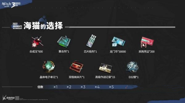 1.今年明日方舟三周年没有准备兑换码,发布的全服奖励只要登录游戏就能获得三周年。