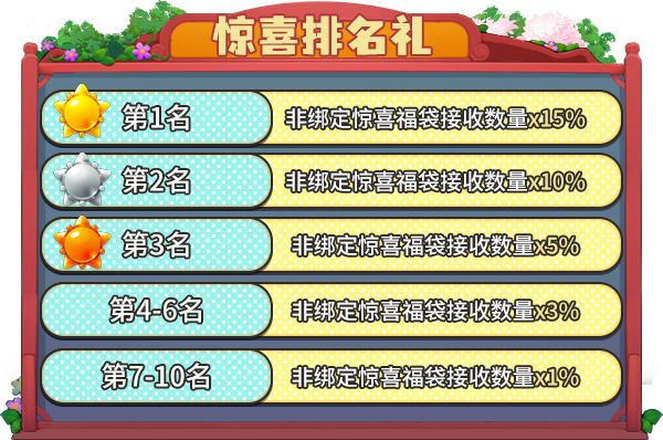 活动规则:“惊喜排名礼”将按名次赠送对应百分比的非绑定惊喜福袋。