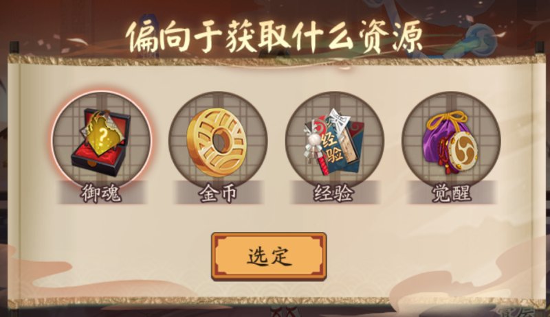 挑战开始前,阴阳师需在御魂、金币、经验、觉醒中选择偏向获取的资源。