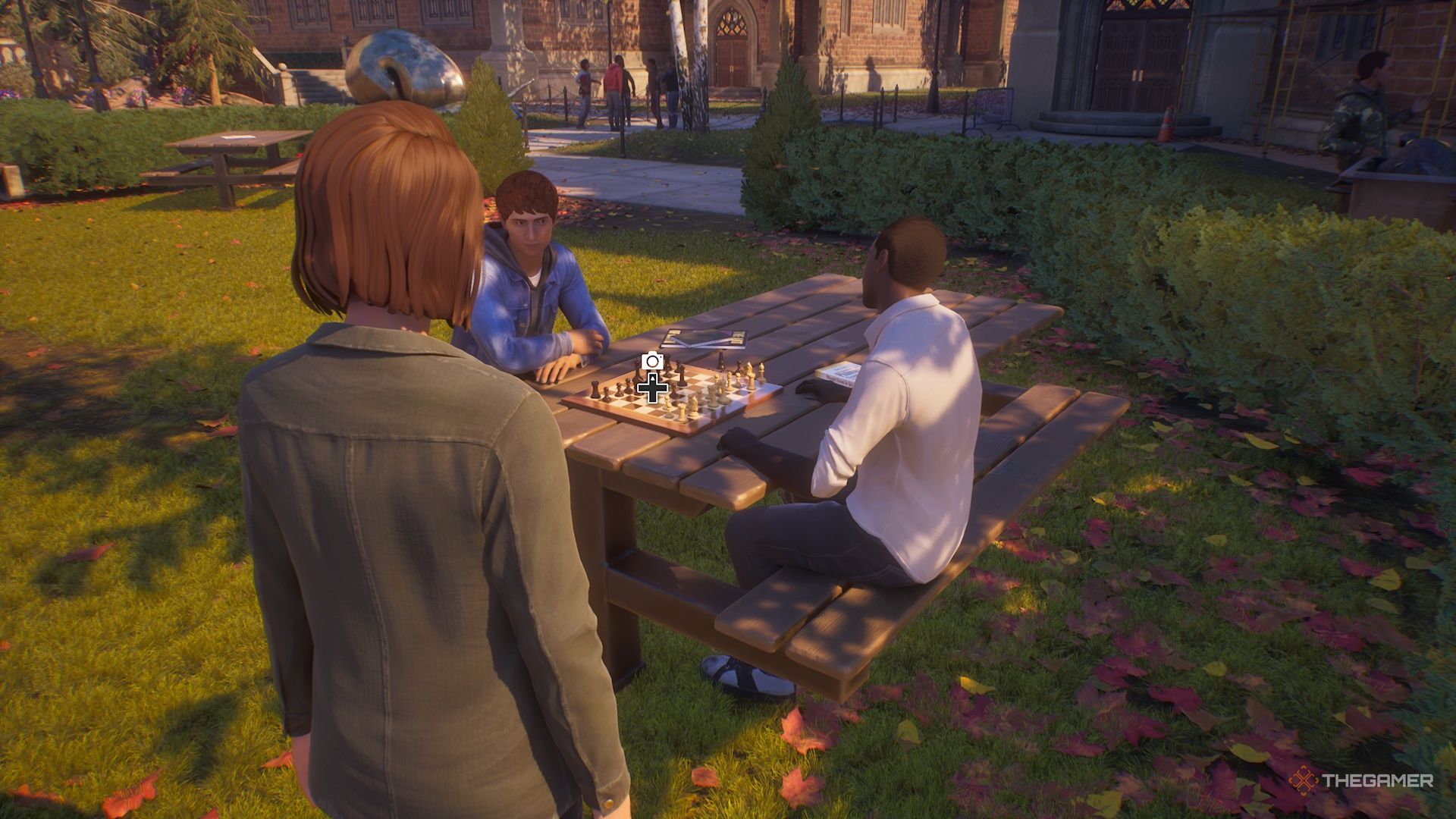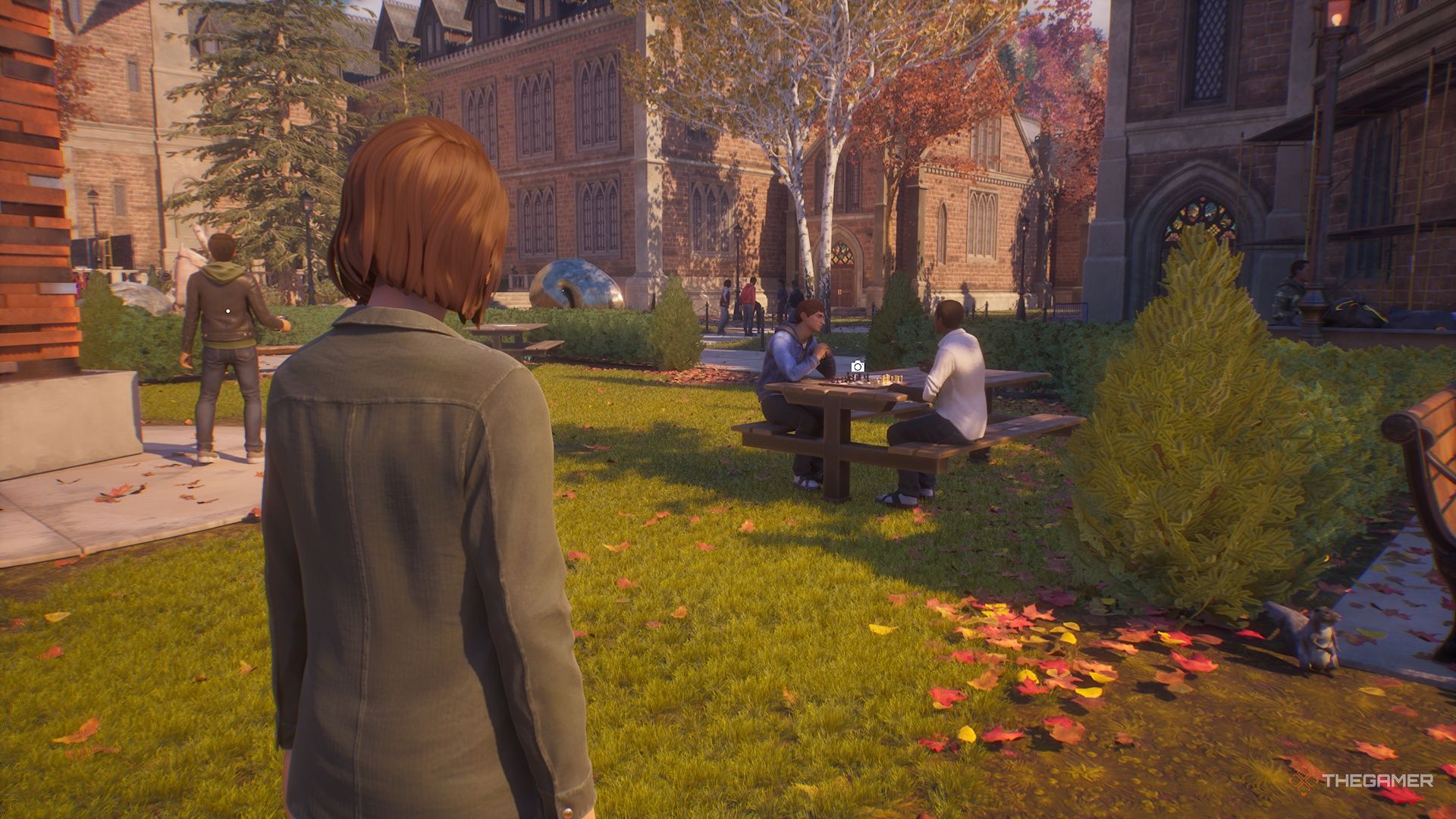 在摄影课期间广场的右侧,你可以找到一片草地,那里有雷吉和一堵巨大的墙。 Reggie 旁边有一些正在下棋的学生。给他们拍张照片。