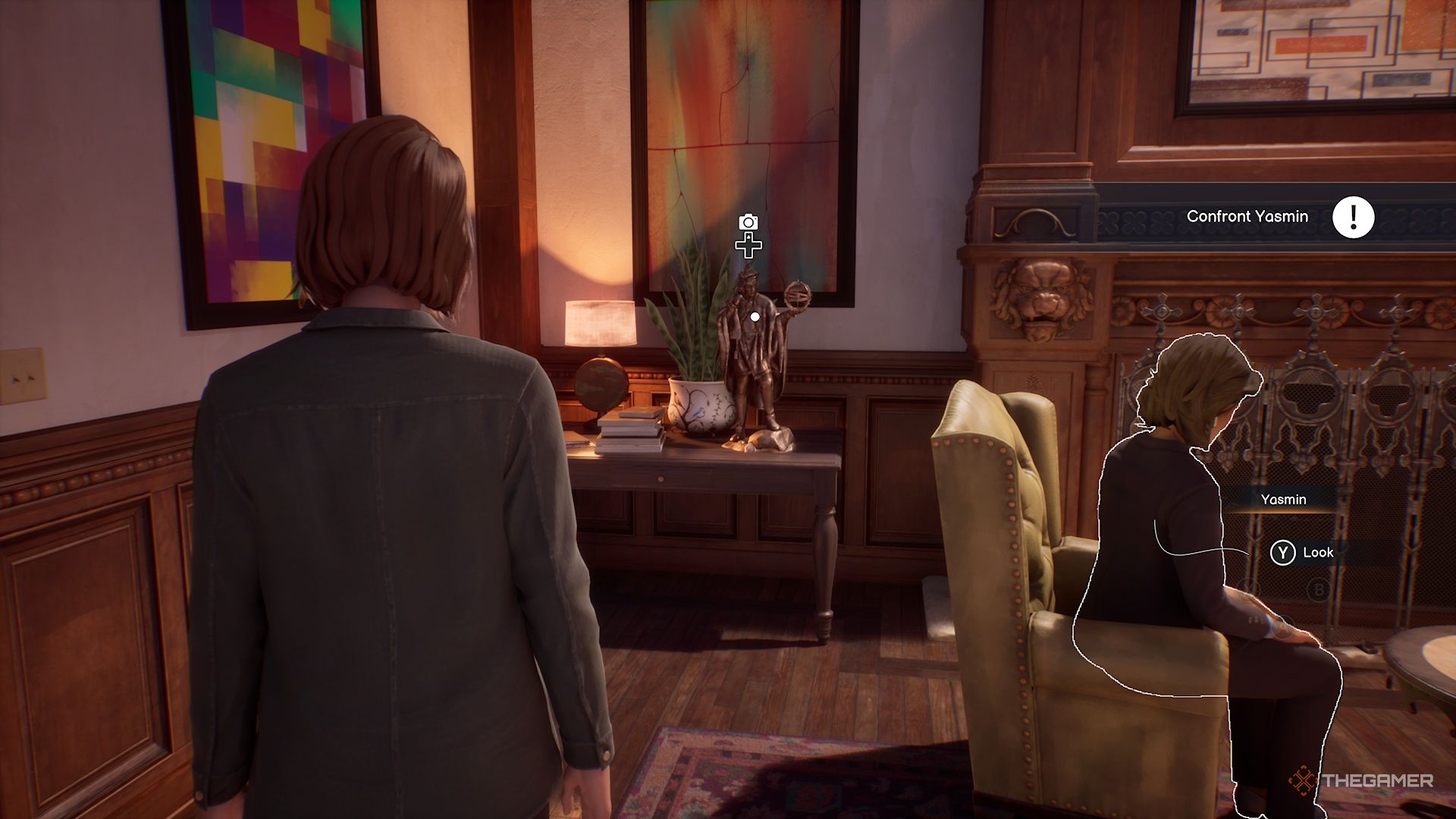 输入办公室与雅斯敏对质后、向左看,找到一个小雕塑。它位于亚斯明椅子旁边的桌子上。给它拍张照片。
