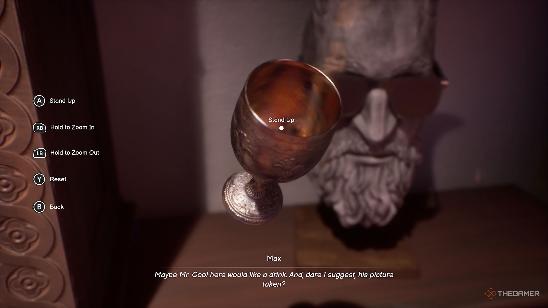 当你刚进入阿布拉克萨斯之家参加秋分派对时,向左走找到一个壁炉。旁边是一个恶魔半身像和一个高脚杯。检查高脚杯并将其移动到出现将其立起来的选项。然后,拍一张魔鬼和高脚杯的照片。
