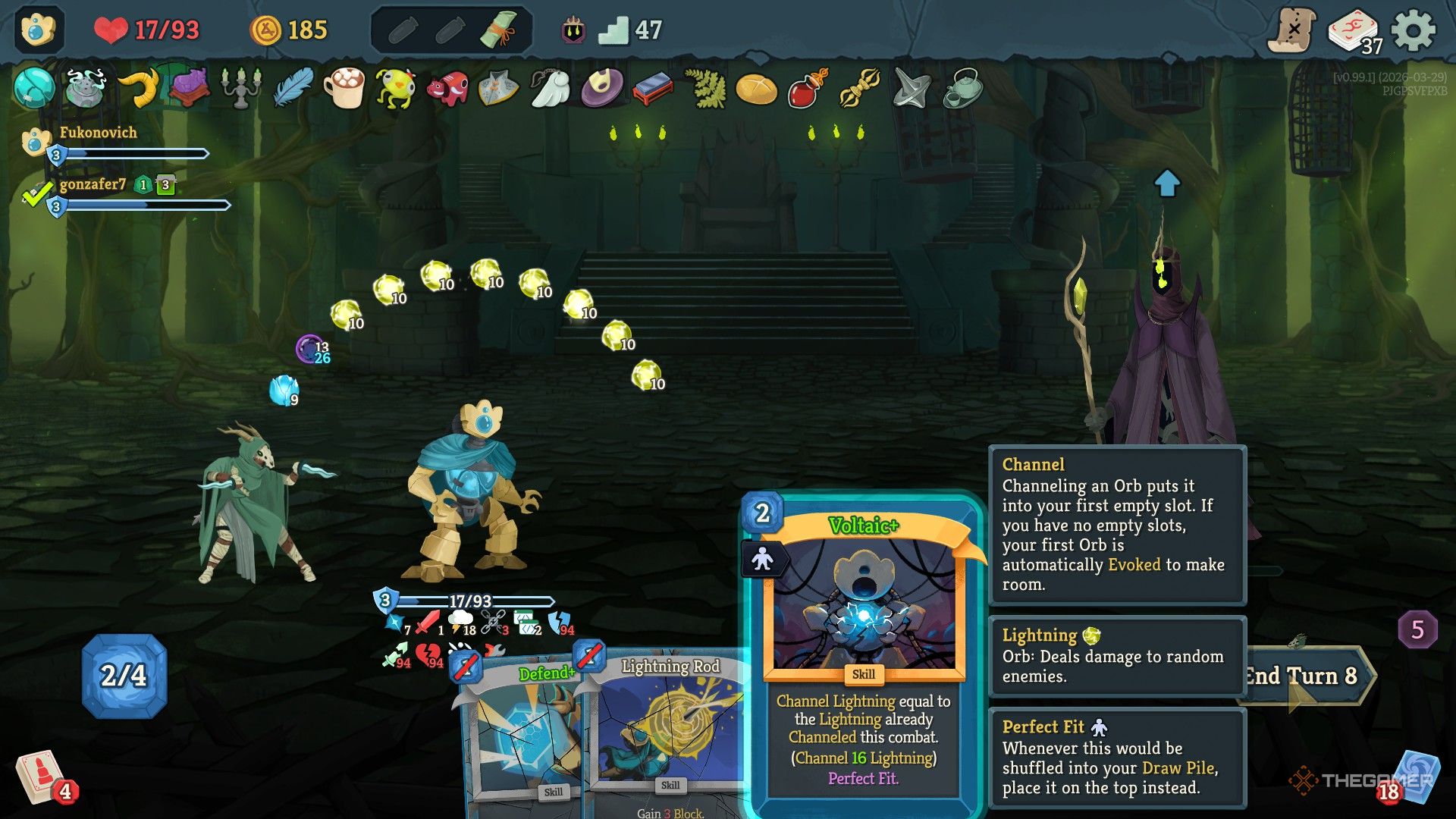 “伏特”可以让你引导闪电球,次数与你在当前战斗中引导闪电球的次数相同。起初,这可能没有多大帮助,因为您可能没有很多闪电卡。此外,它具有“消耗”效果,因此只能使用一次。