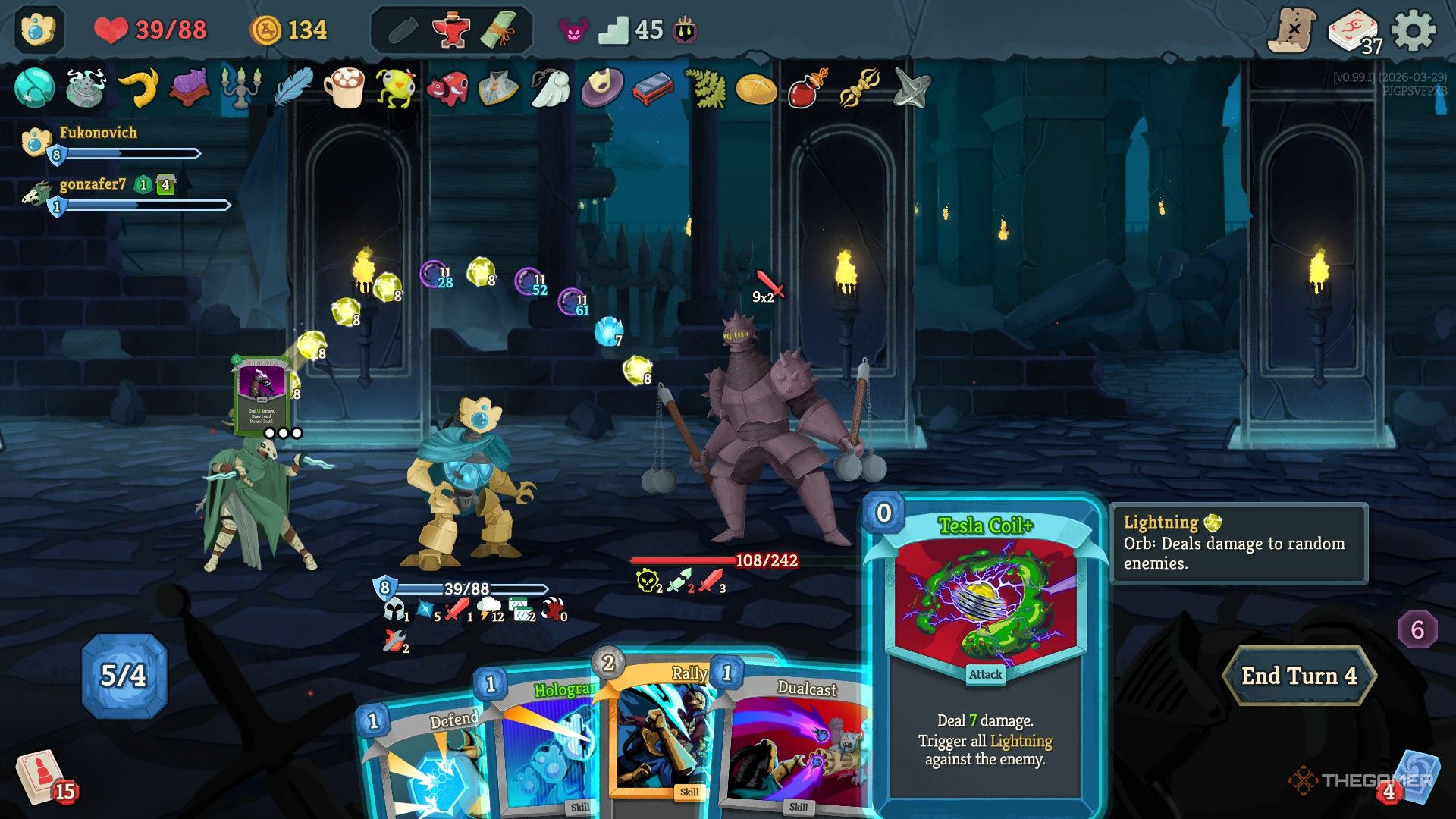 当你已经拥有很多闪电球时,“特斯拉线圈”就会派上用场。它给你将所有闪电球的伤害集中到一个选定的目标,如果你使用一张“电容器”和任何增加“集中”的卡(增加你的奥术球的数量),你会让那个敌人受到重创。