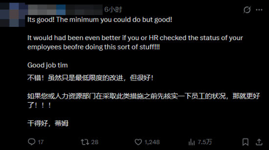 在这条推文的评论区,虽然有部分玩家对蒂姆后续的支持表示肯定,但绝大多数声音都对蒂姆进行了猛烈的批评,认为他本可以避免裁员。