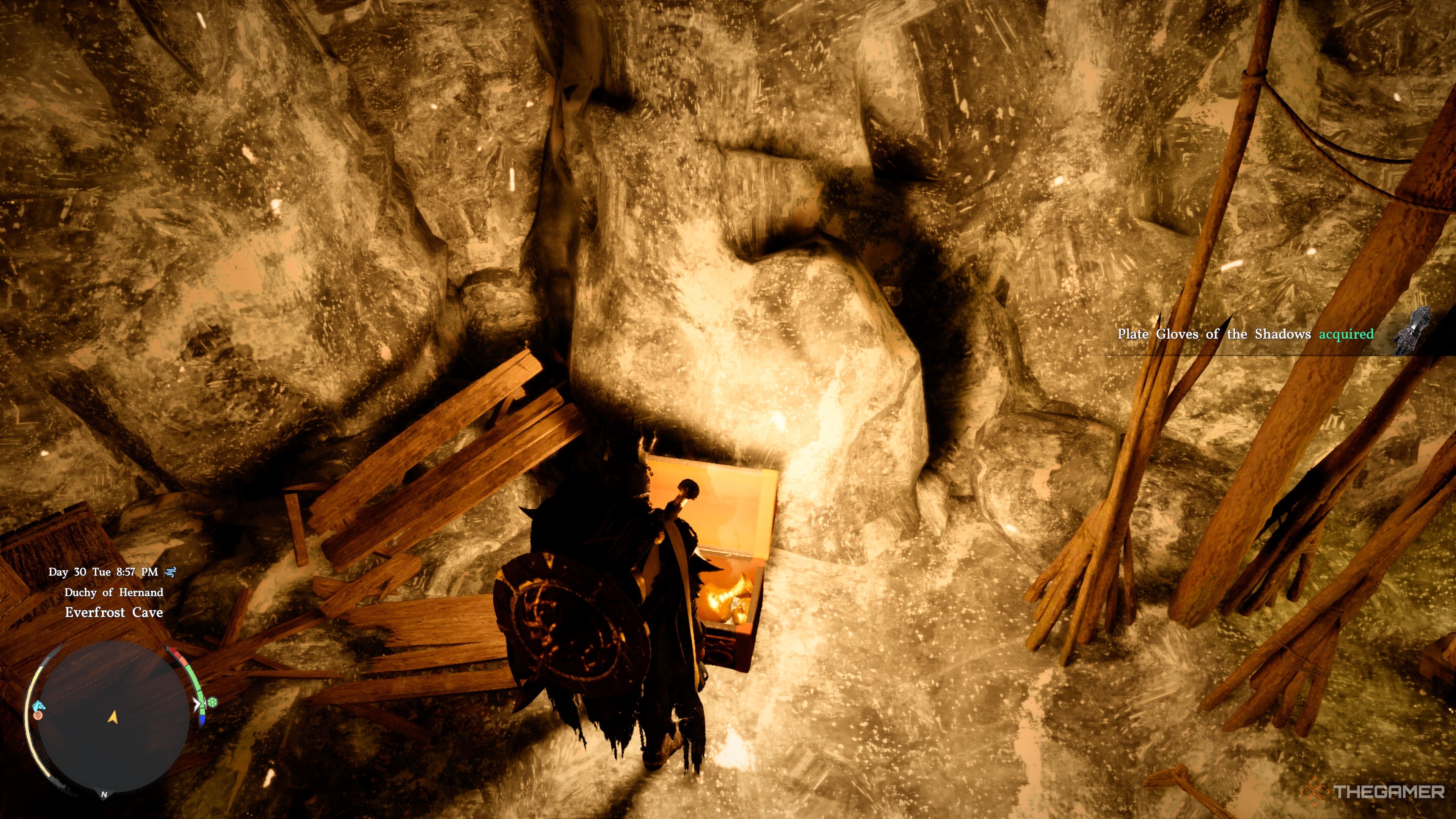 找到入口后,进入洞穴,由于冰层的作用,你会滑过洞穴。深入洞穴得到暗影护手。