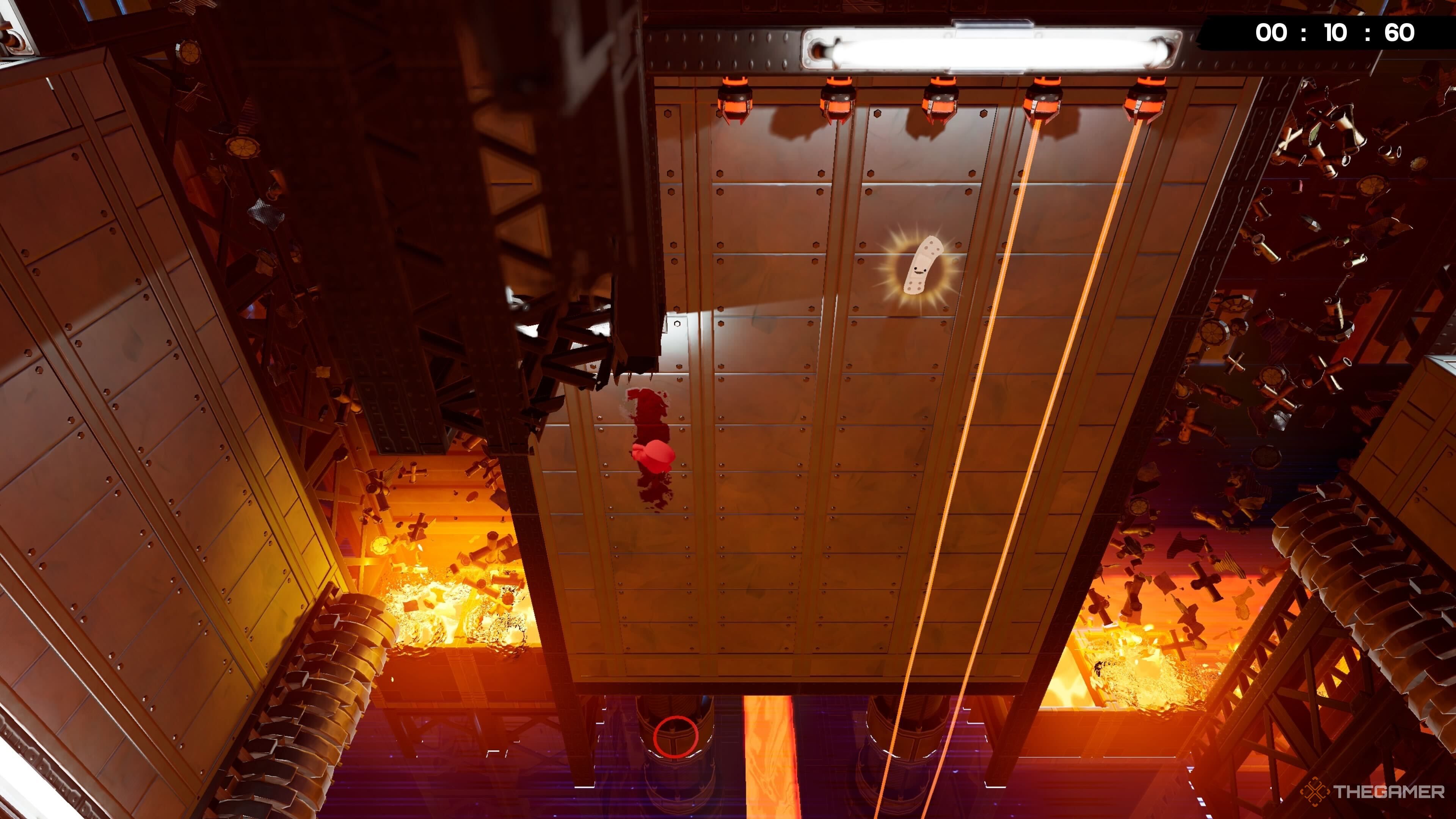 欢迎来到整个《Super Meat Boy 3D》 中我最不喜欢的关卡之一。如需获取该级别的绷带,请致电到达关卡末端的传送带,然后等待炽热方块切断激光,为你开辟一条向左的路径。之后,跳到屏幕上的绷带处。