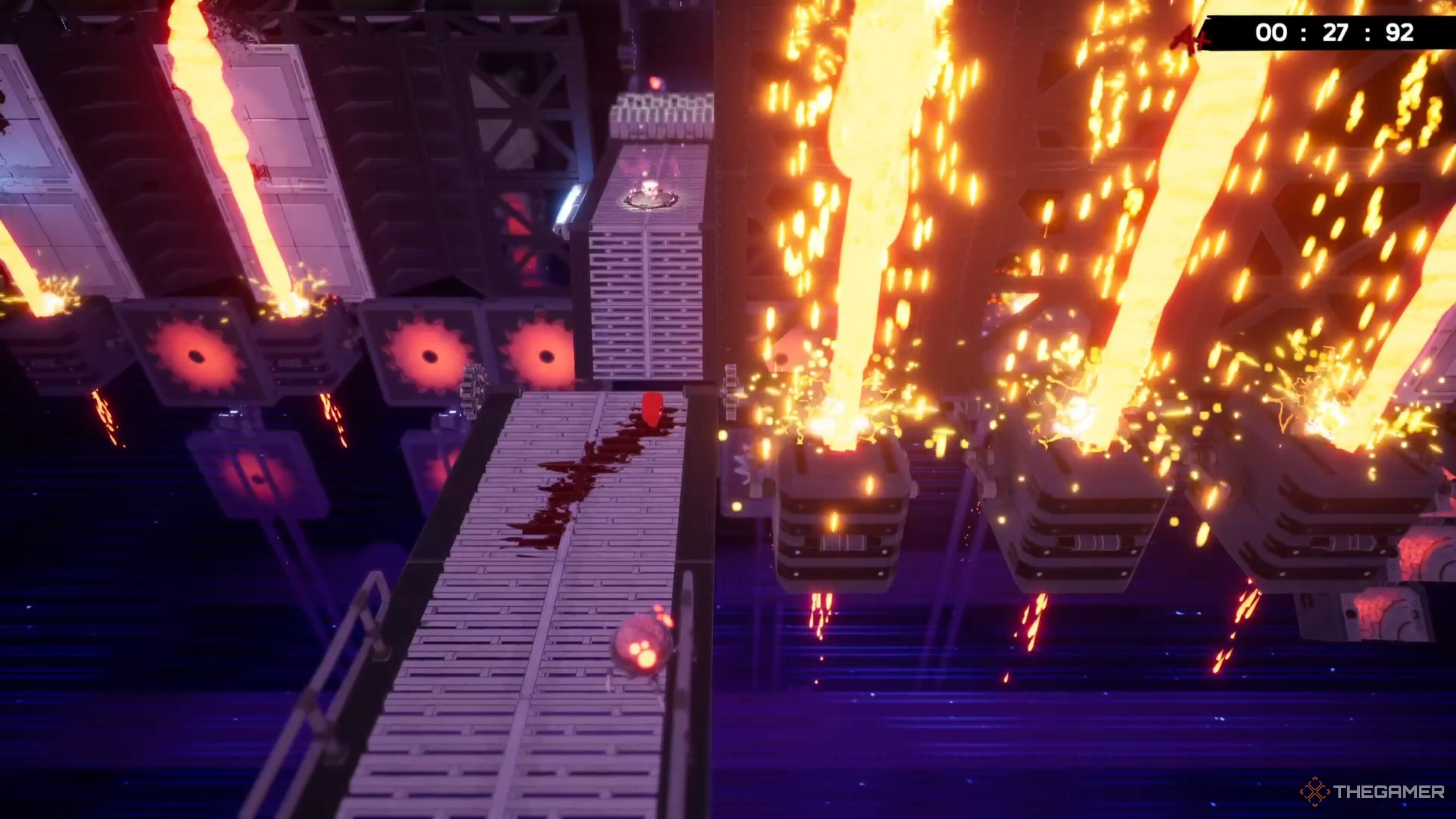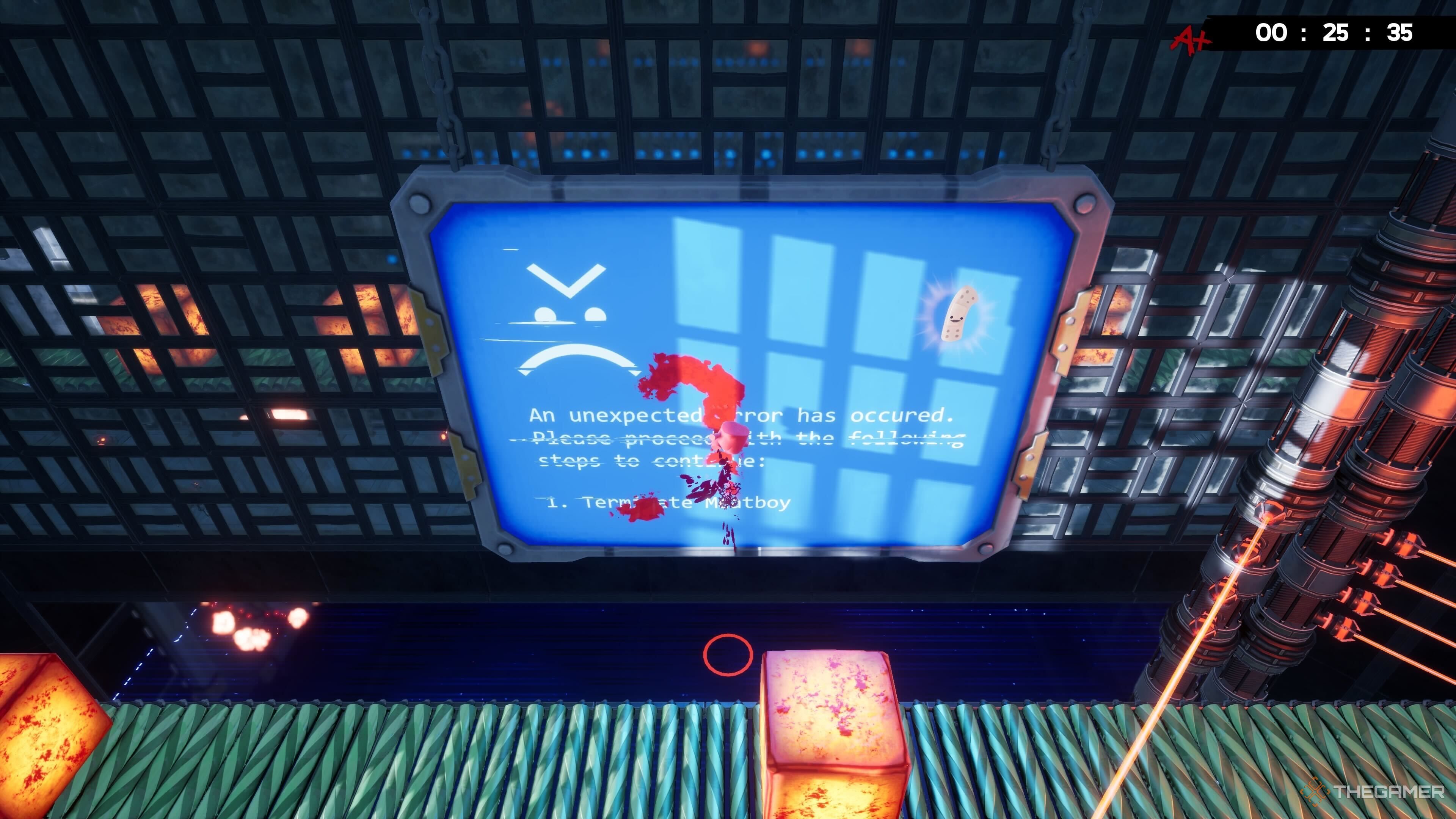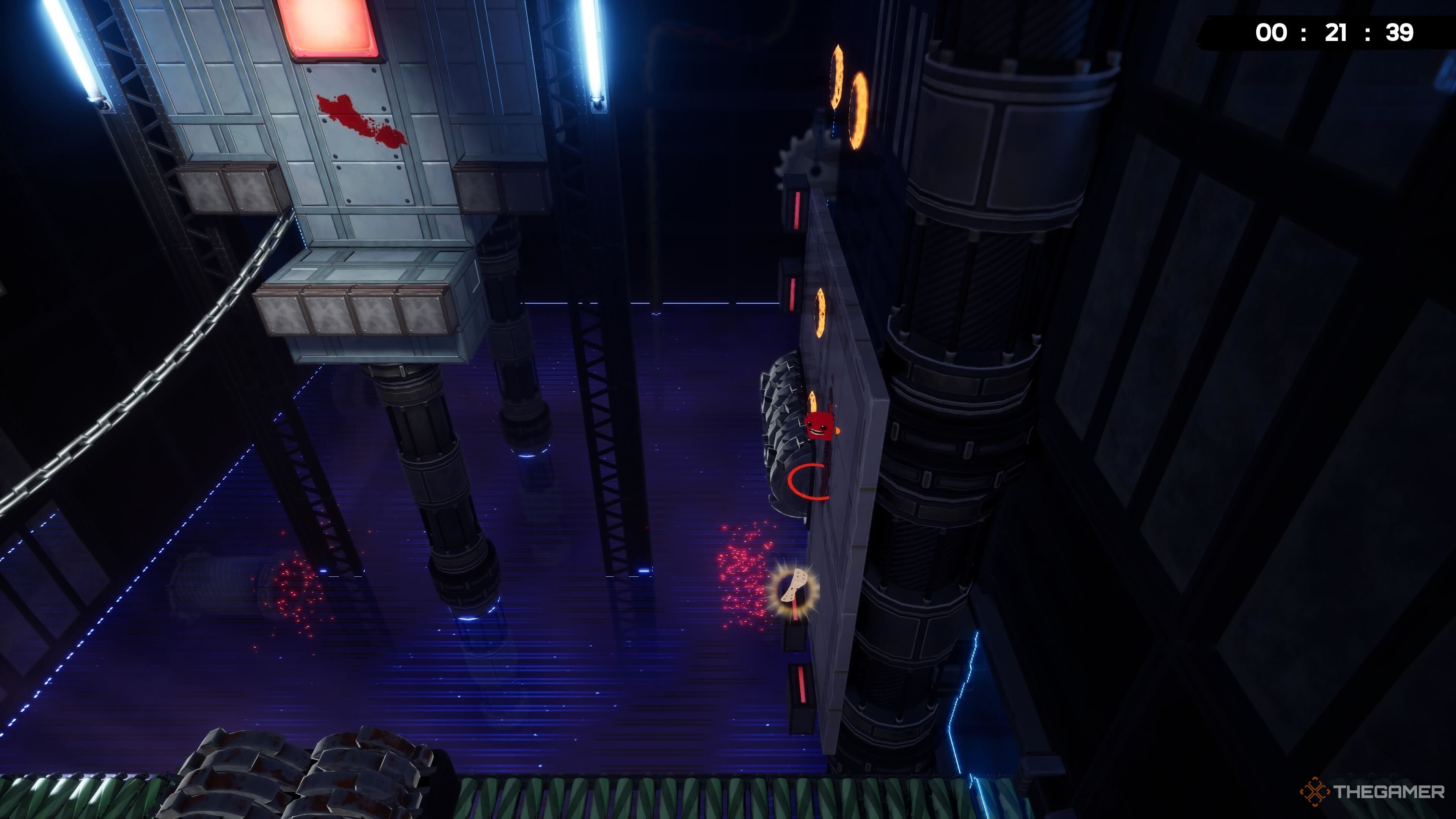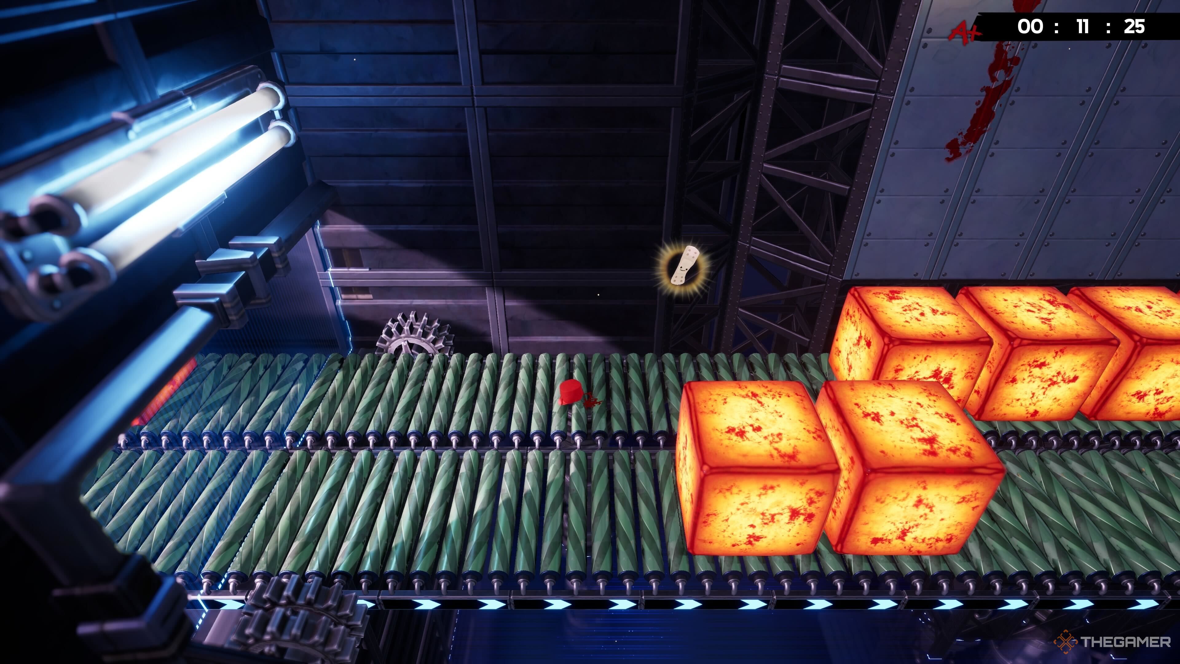 《Blazing Cube》中还有一个相当简单的绷带,尽管将它带到关卡的末尾是令人讨厌的部分。第一次爬上传送带后,您会看到另一条传送带带您继续向上。别上去,乘着它并向左跳以够到绷带。只需要留意会经过它的同名火焰块,然后利用墙壁向后跳。