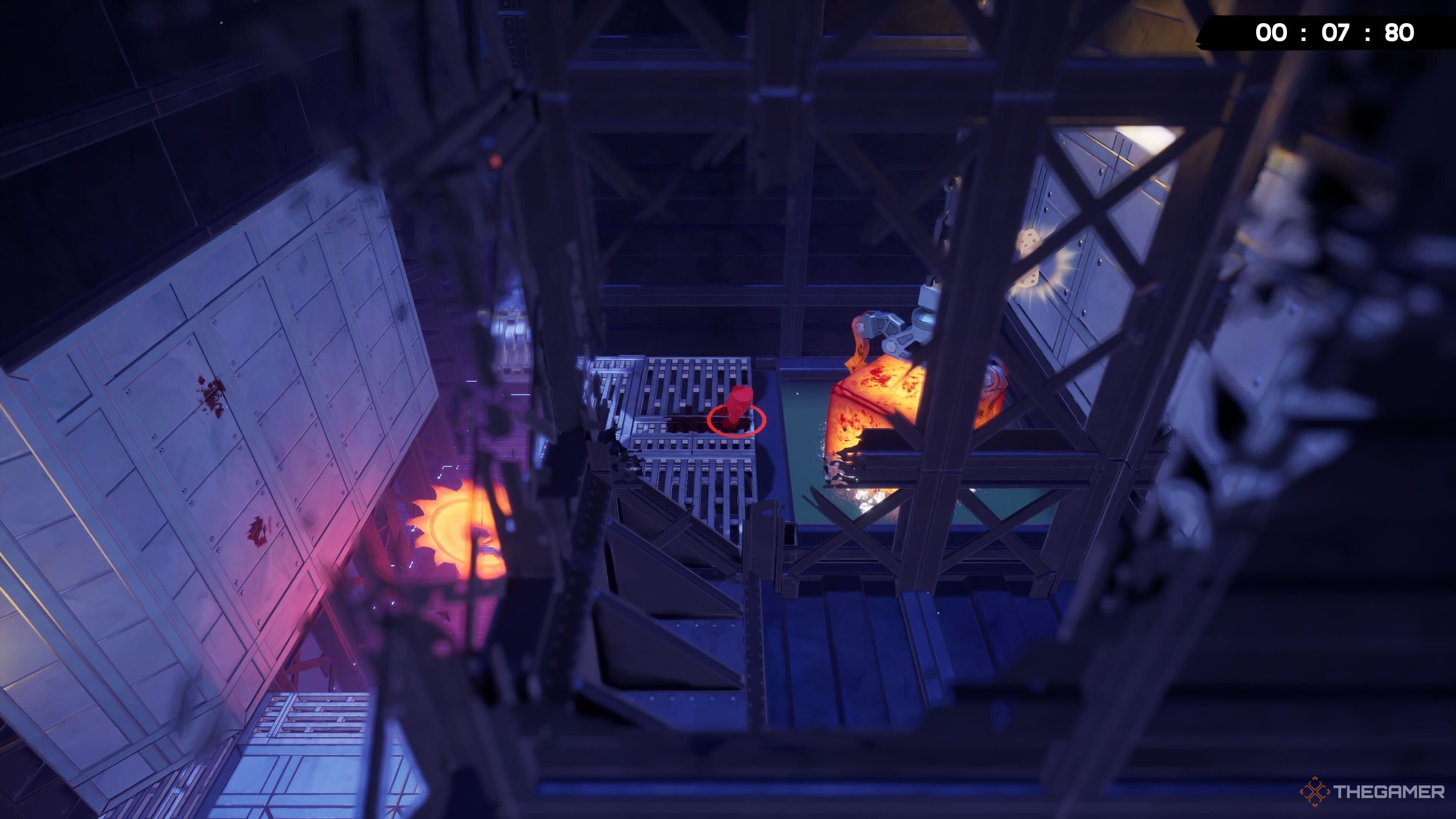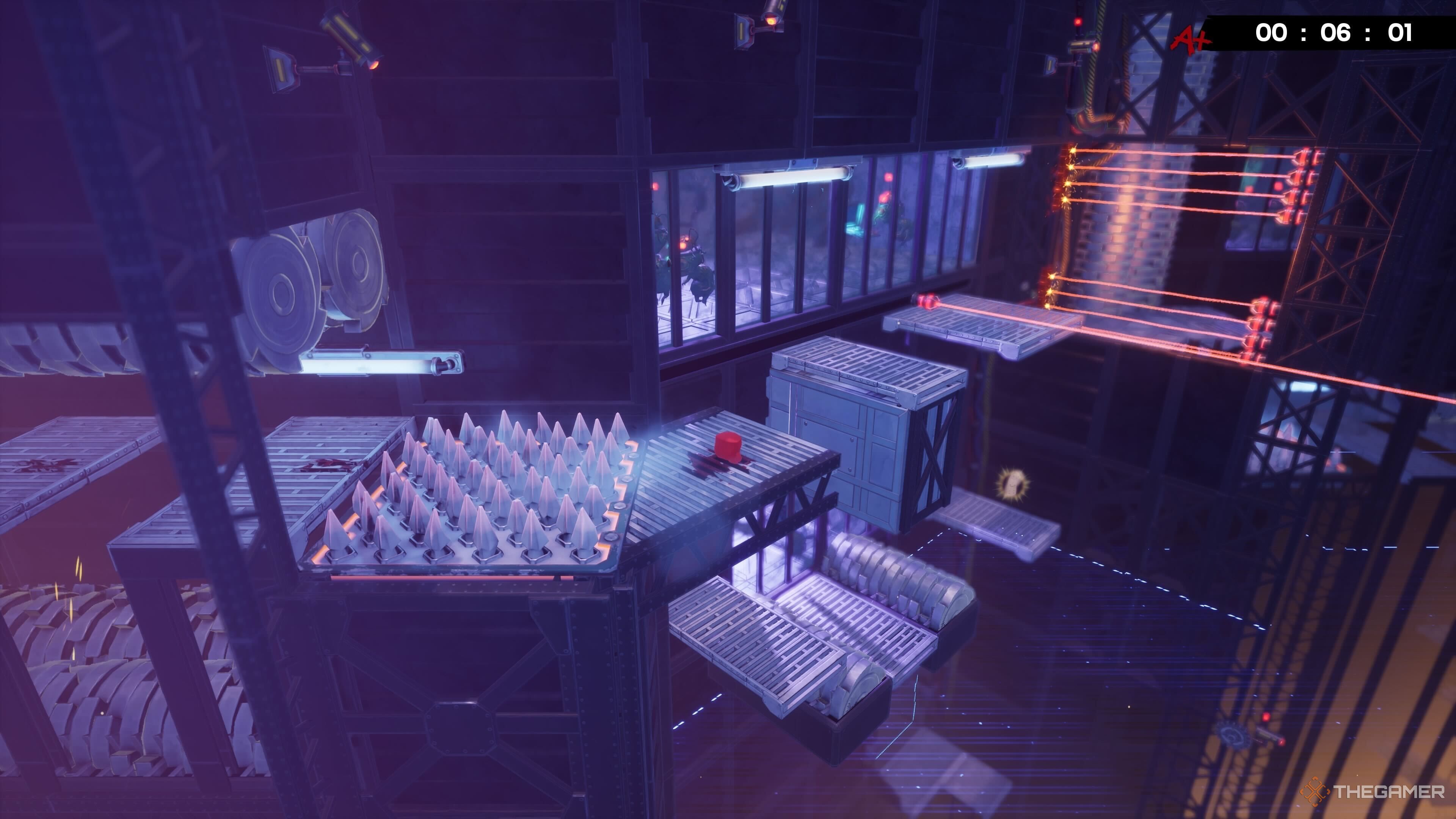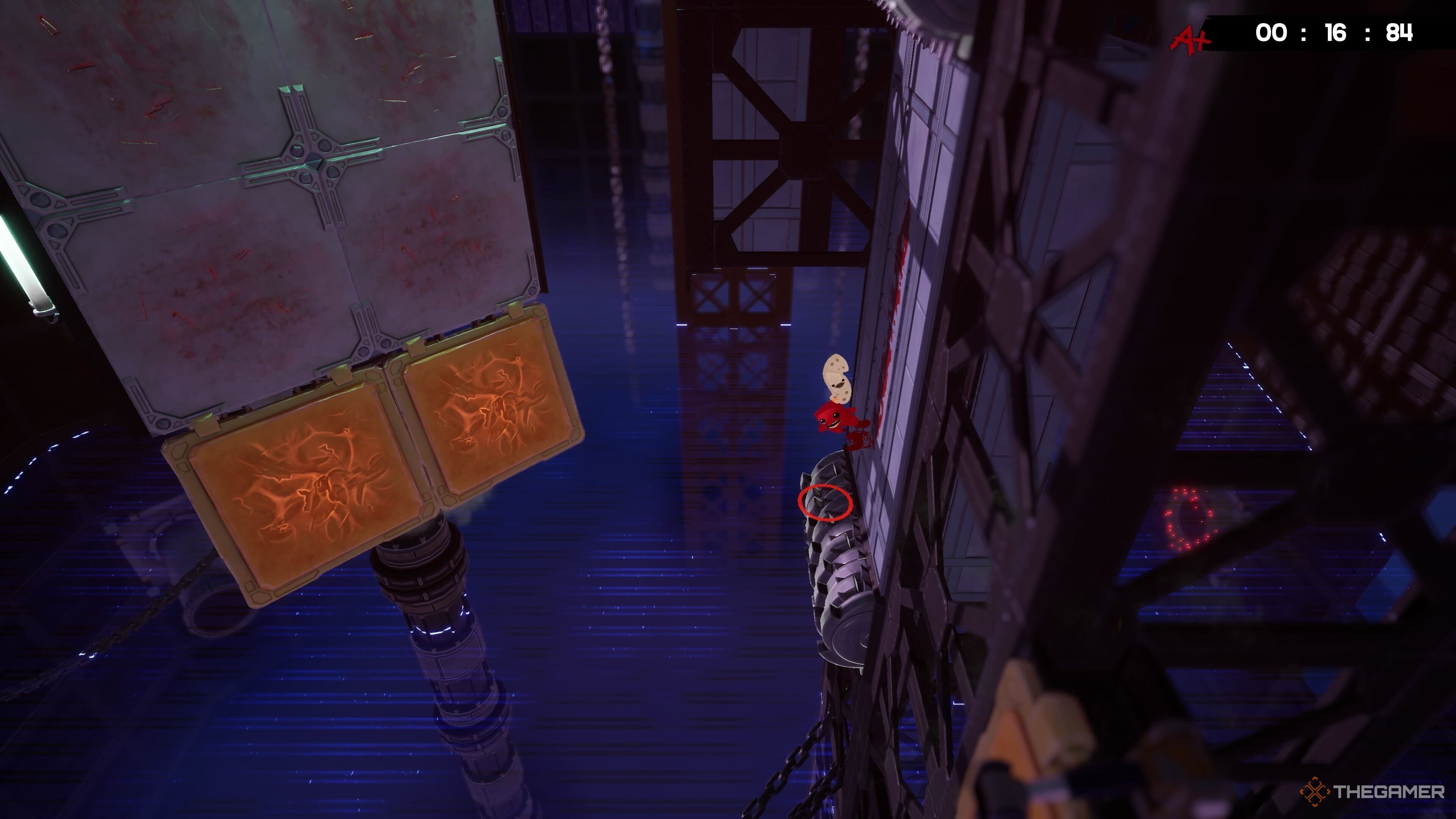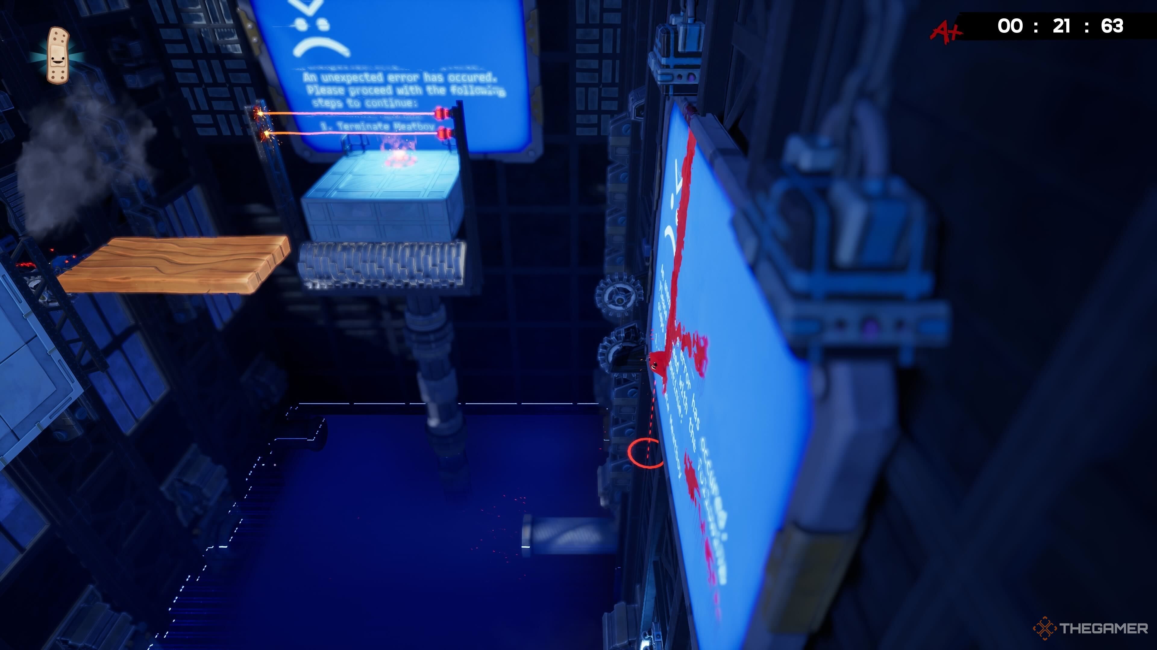 “测试室”中的绷带接近关卡的尽头。当您到达时请致电那个为绷带女孩清除路径的大红按钮时,跳到右边抓住绷带。时机有点棘手,所以尽快跳回中间平台。