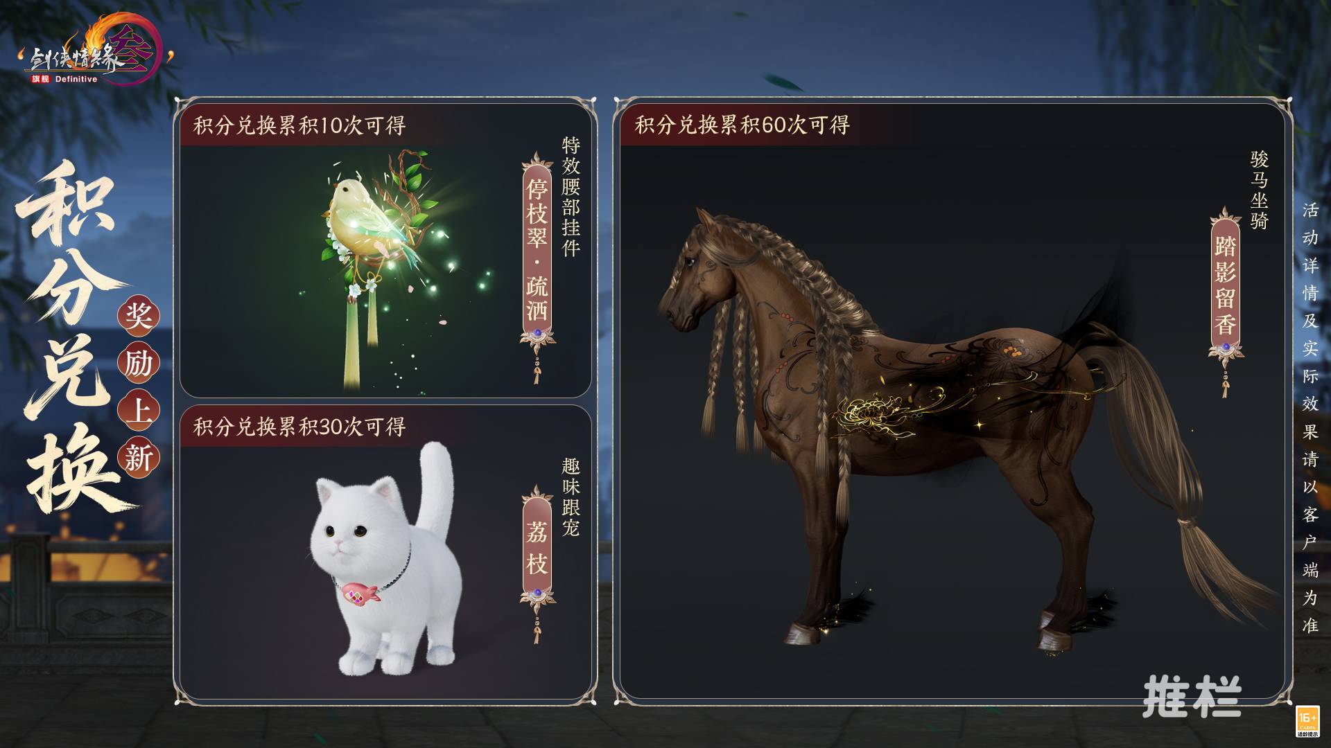 新一期积分兑换奖励上线,多重奖励同时领取!参与新一期积分兑换90次,即可获得二代复制品外衣“画中慧·闹智”;参与新一期积分兑换60次,即可获得坐骑“影留香”,它体现了沉阳古风,长辫如丝带随风垂下,马蹄上飘着淡淡的清香。还有特效腰饰和可爱宠物,帮你解锁更多乐趣!