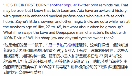 虽然卡普空还没有官宣,但是很多粉丝心里已经确定了,和Leon结婚的人就是Ada Wang。据GamesRadar+ 报道,一个Meme 目前正在互联网上疯传。有玩家认为莱昂和艾达不仅结婚了,还育有一个儿子,而这个人也是国内B游戏《恋与深空》的男主角之一李绅。