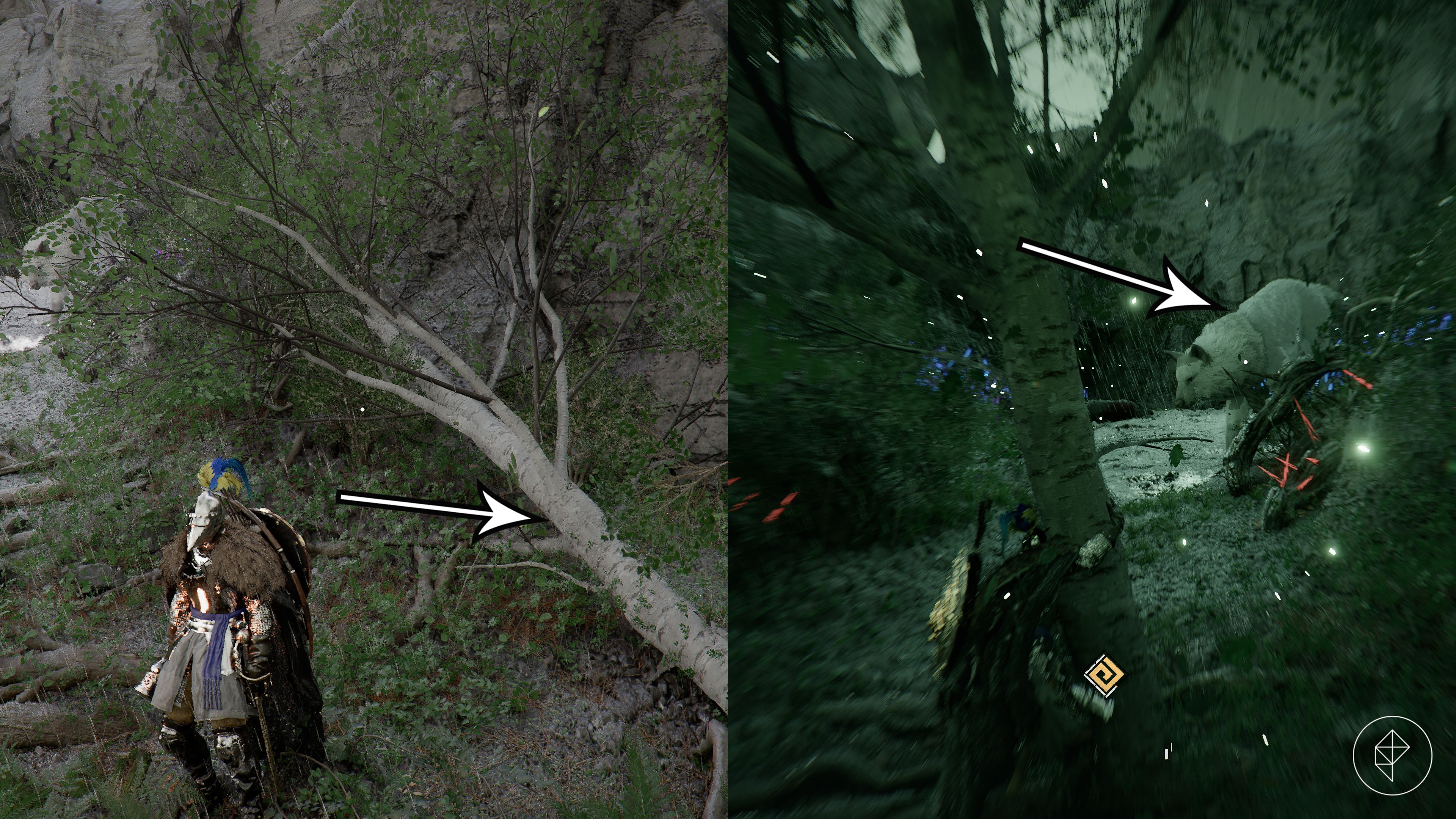 但战斗还没有结束;耗尽黑牙的生命值后,传奇狼会逃跑。再次使用你的灯笼来追踪它。第二阶段的战斗发生在更西边的在嚎叫谷地上方的斜坡上。同样,你可以使用自然之握用它的树干猛击黑牙。