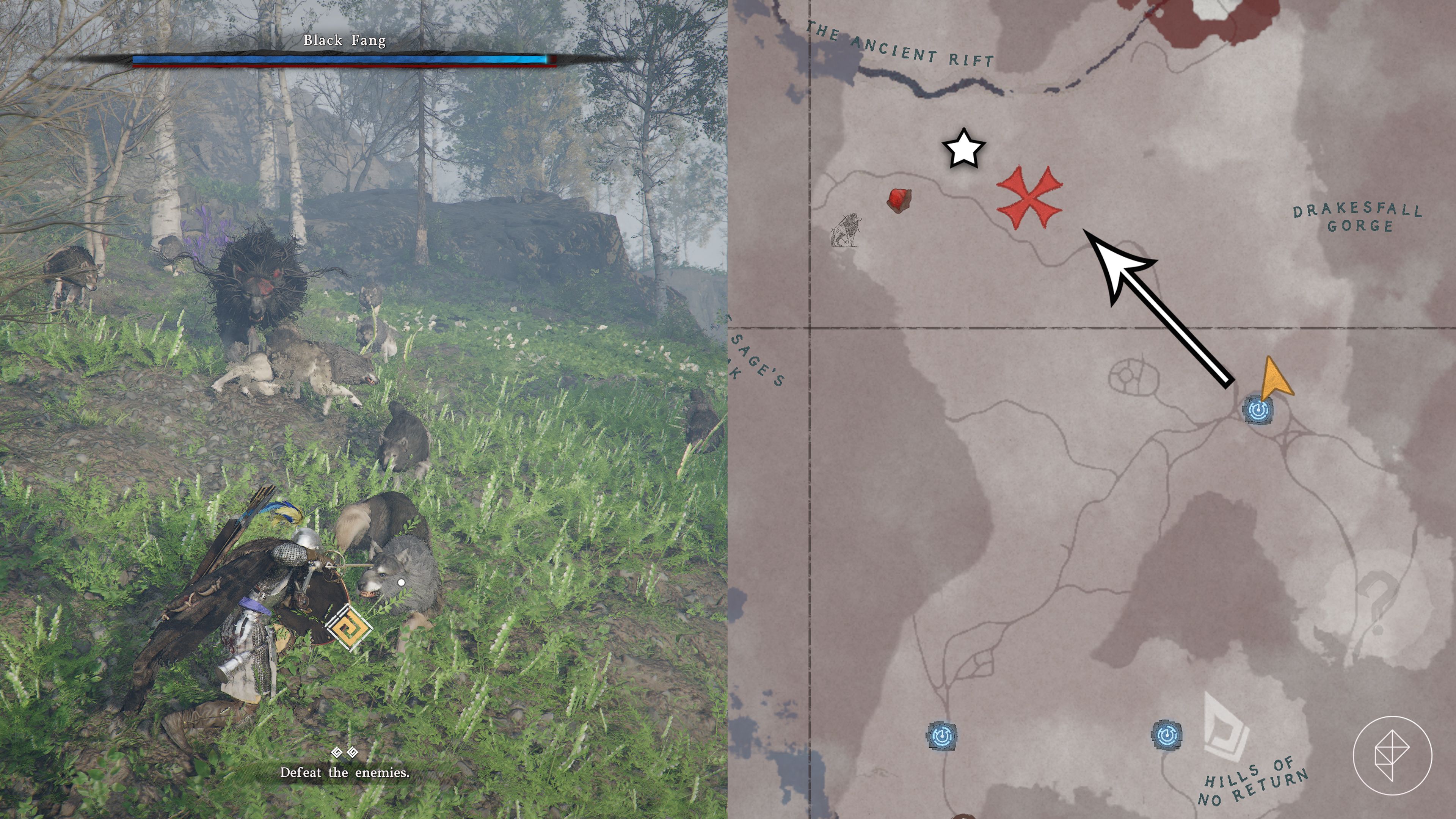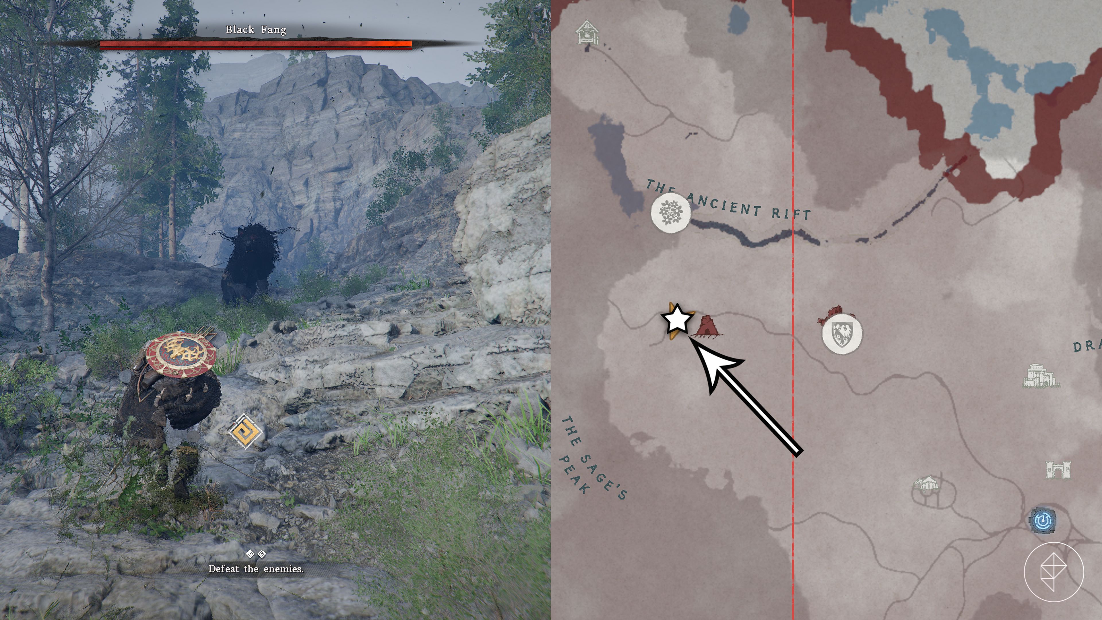 传说中的狼黑牙位于悬崖边缘,周围环绕着较小的狼群。为了让战斗更容易一点,你可以尝试在先解决掉小怪时阻止黑牙的攻击(它们不会重生)。一次击倒黑牙一半生命值的好方法是使用自然之握抓起一棵树,然后砸向黑牙。