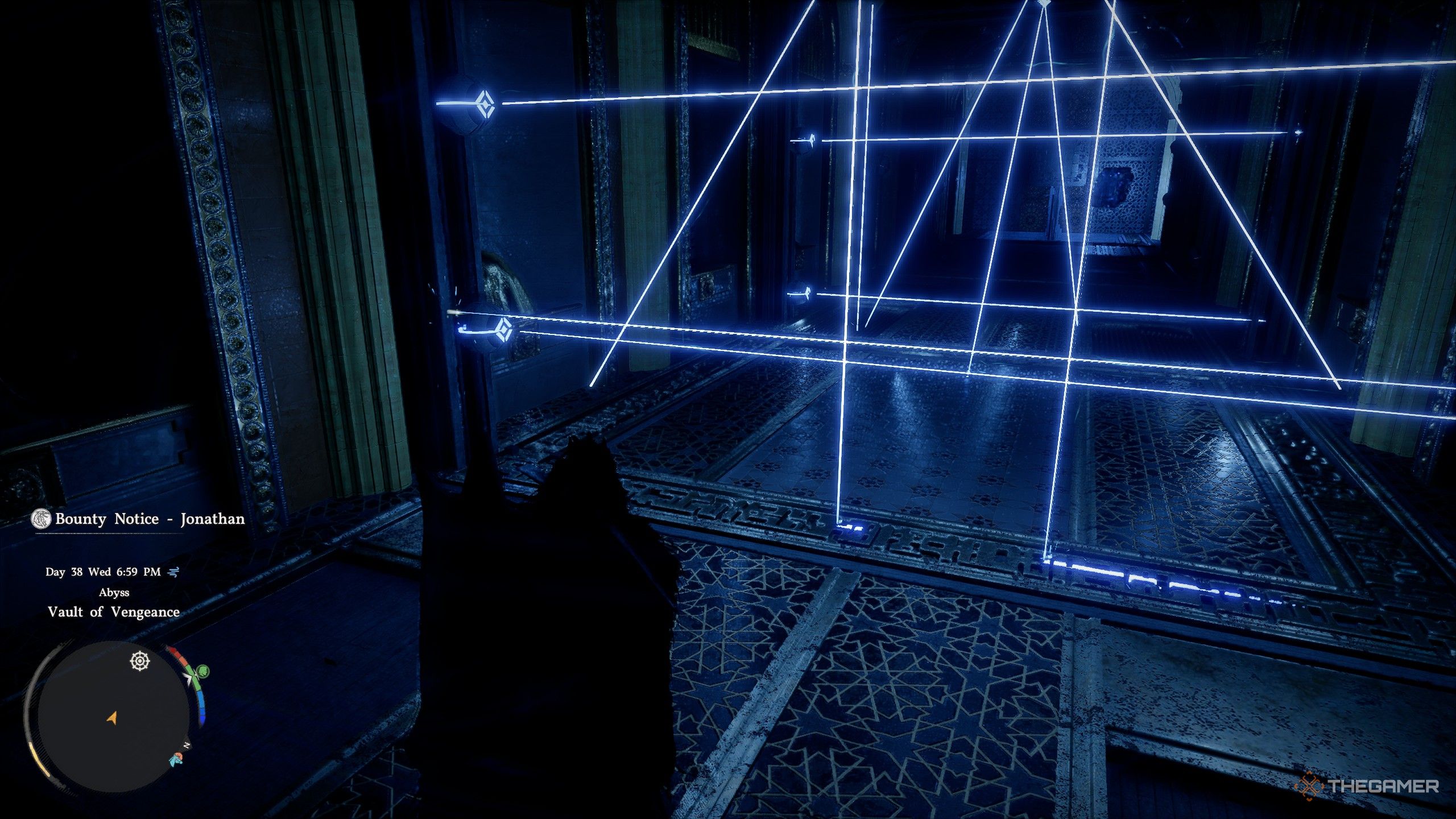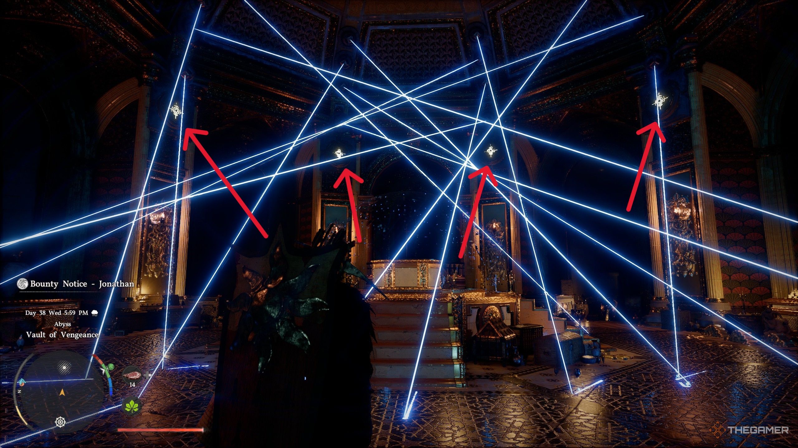 一旦进入,一系列激光束就会被激活并覆盖整个房间。停留在主厅入口处,再次使用“专注射击”射击房间后方左右两侧靠近天花板的四个开关。这样做会关闭激光,让你可以拿起中央平台上的剑。捡起它会使平台掉入狭窄的走廊。