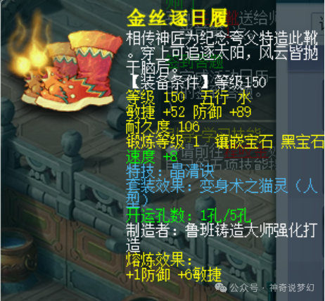 鞋子是增加速度最多的装备部分,而鞋子只能用黑色宝石来开采,所以鞋子的价格相对于普通装备价格来说比较稳定。这双150级的鞋子是梦幻保值神器,敏捷52,防御89,熔炼后防御达到了90点,敏捷达到了58点。从属性上来看,这双鞋的属性还不错,速度和防御都在平均水平以上,但是否配得上高级宝石,就看蓝字了。