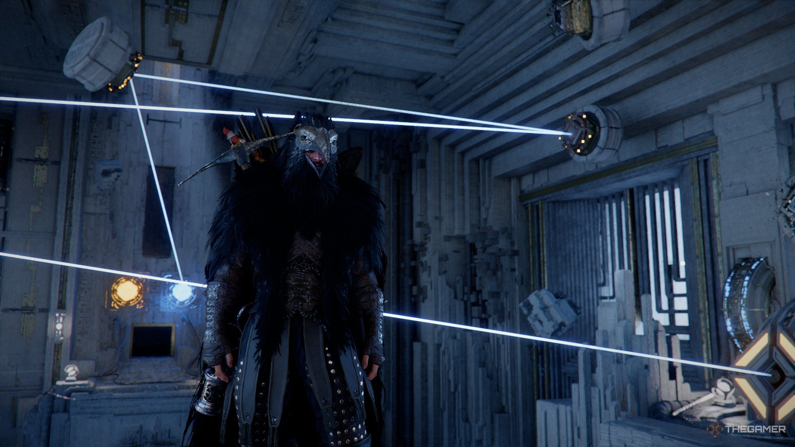 乘着一系列风扇,直到你到达一个巨大的圆环,其东北侧连接着一个平台。降落在这个平台上,寻找右侧的一个小洞,里面有一大束粗电缆。您应该会看到一个黄色的小控制开关,可以与Axiom Force 连接。