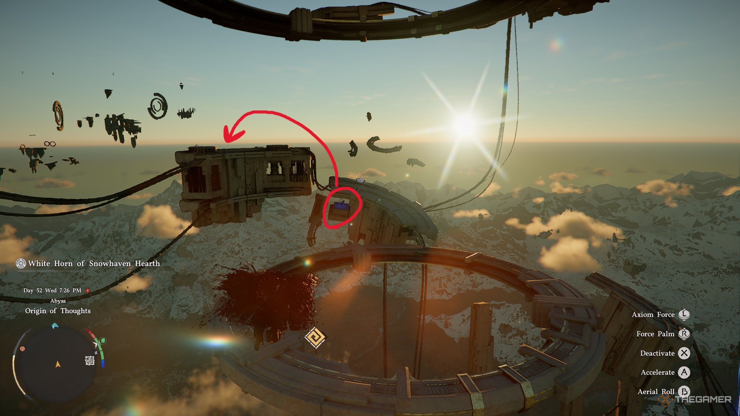当你到达思想之源时,启动深渊之门,然后启动向左看,那里有一组巨大的风扇正在向天空吹风。乘这风到第一环,然后向东南看,飞向下一组扇。利用这些风扇滑行到另一个浮环上,但这一次那里的风扇停了下来。