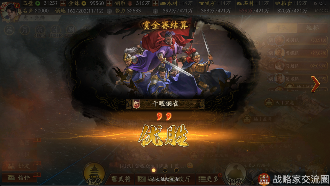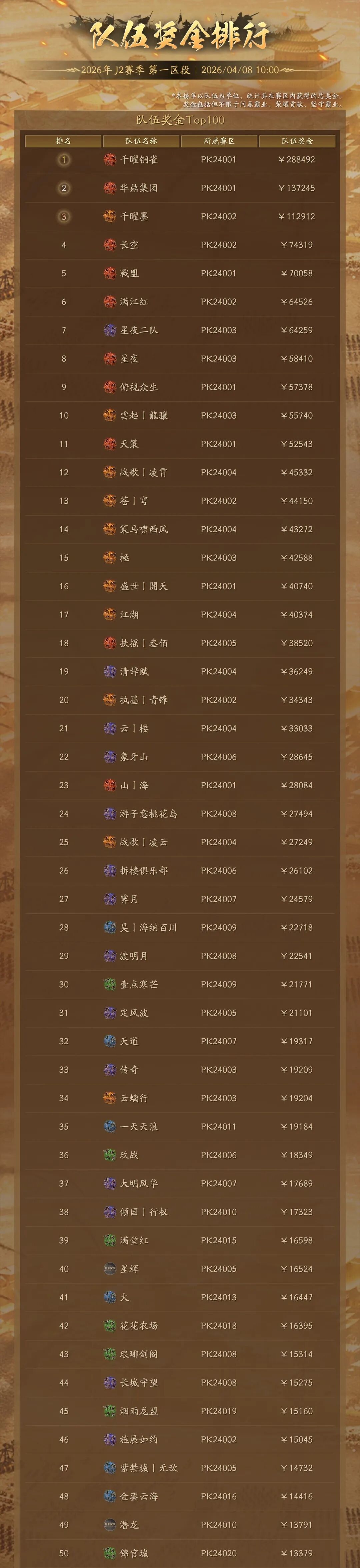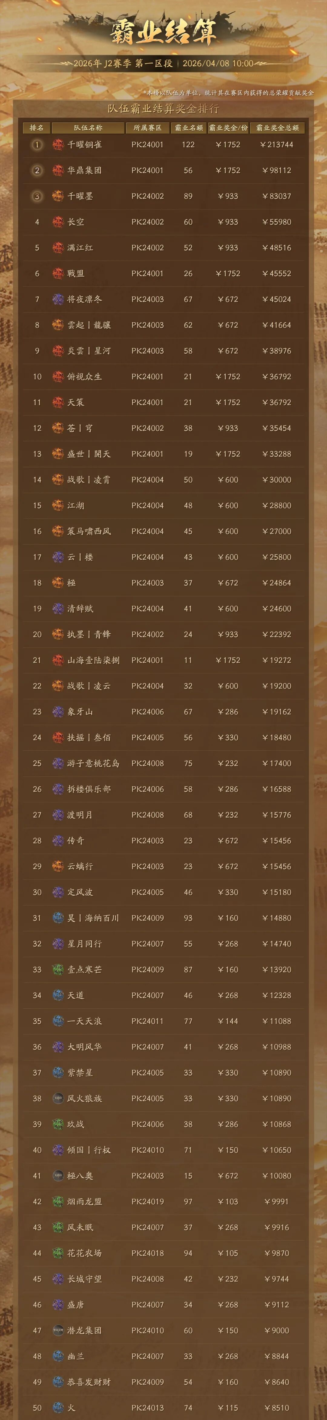 一区段霸业结算奖金排行TOP50群雄逐鹿,强者如林。根据结算数量和统治力获得的奖金数量,公布某一部分的前50 名队伍!