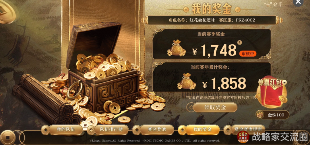 @坏脾气老师:新赛季我的奖金怎么增加了100%!上赛季我只拿到了110元的奖金。本赛季1748元奖金,其中统治力奖金933元,荣耀贡献奖金815元,直接翻倍100%!