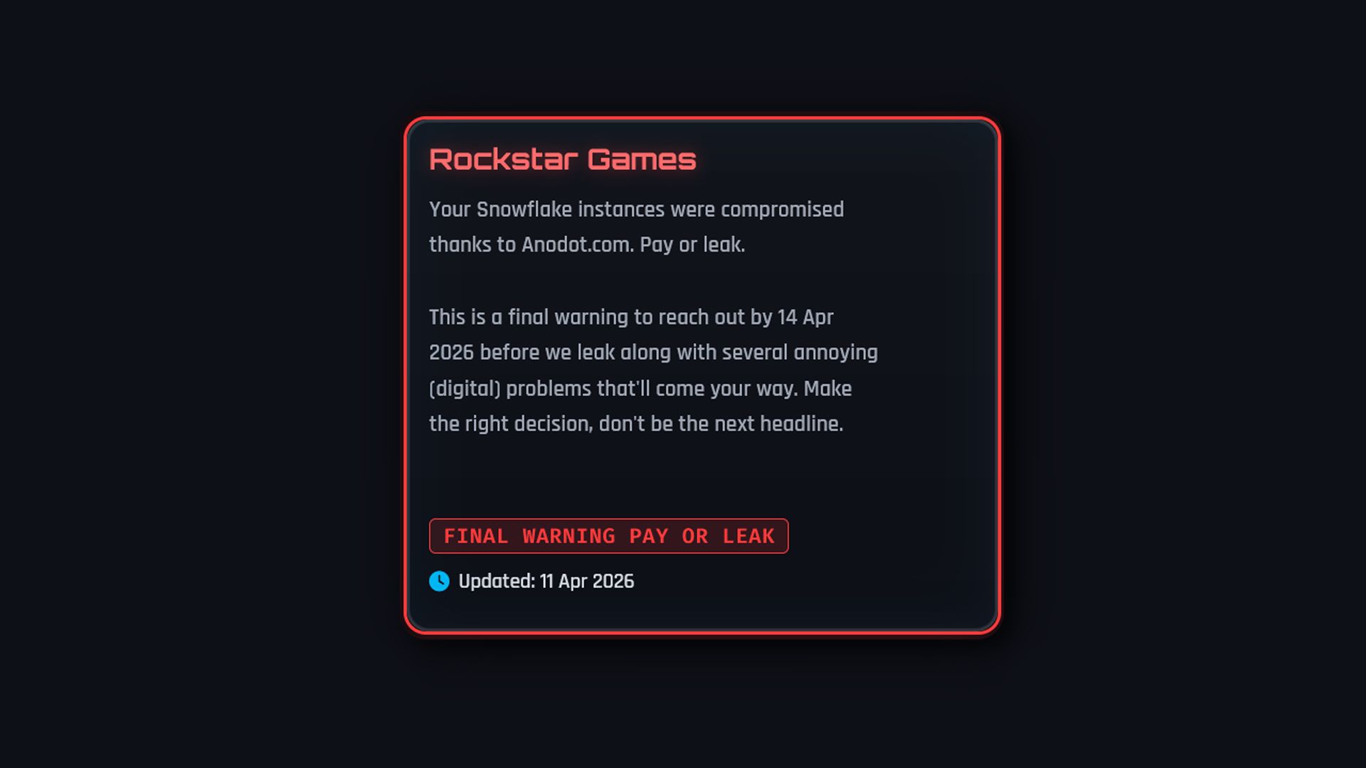 “Rockstar Games,您的Snowflake 实例因Anodot.com 受到威胁。支付赎金或泄露数据,”他们在暗网上发帖。 “这是您最后一次警告,请在2026 年4 月14 日之前联系我们,否则我们将泄露数据,以及一系列烦人的(数字)问题。”做出正确的决定,不要成为下一个头条新闻。 '