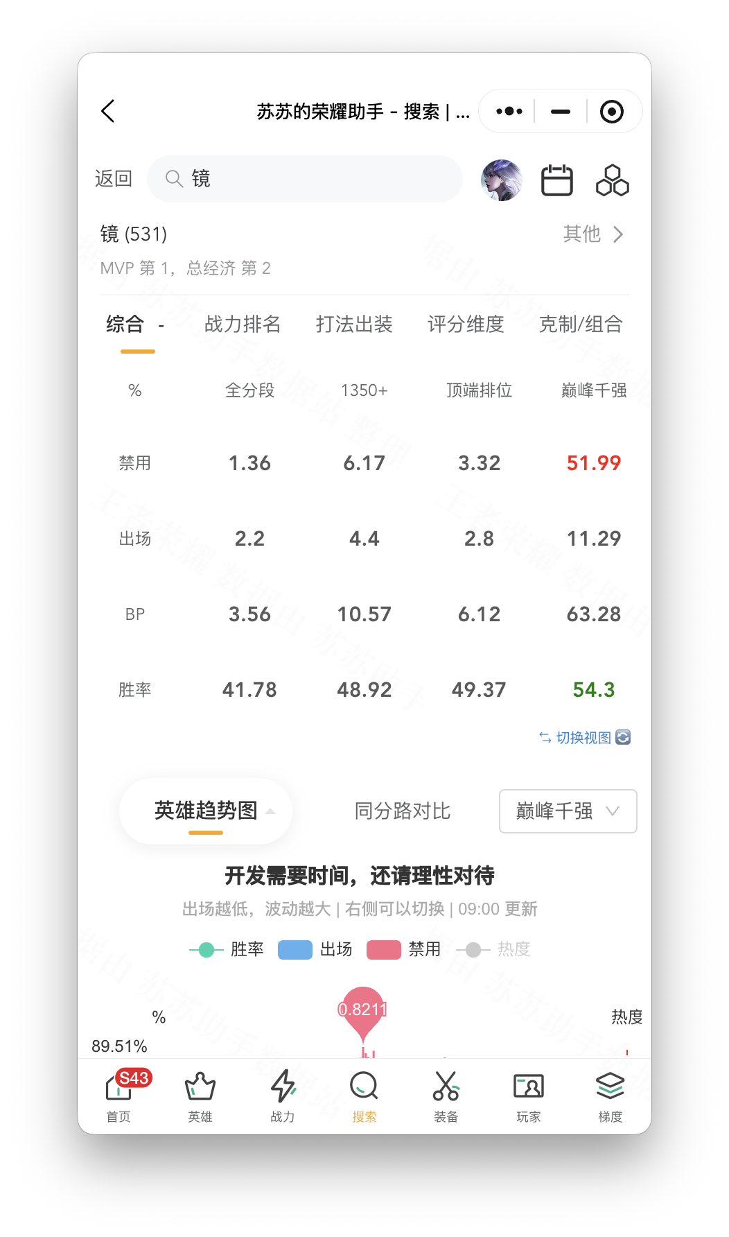 调整后,镜子已经到了最强点,所以胜率明显下降。所有排位赛的胜率本来只有43%以上,现在直接下降到了42%以下,影响不小。巅峰赛的时候,数据本来看上去还不错,现在却跌到了中下位置。不过对于这个英雄来说,主要还是要看高端的游戏表现。完全分段的数据怎么样?其实大可不必担心。巅峰赛前1000名的胜率下降看似很大,但她的胜率通常徘徊在52%到54%之间,所以我们必须密切关注。 02