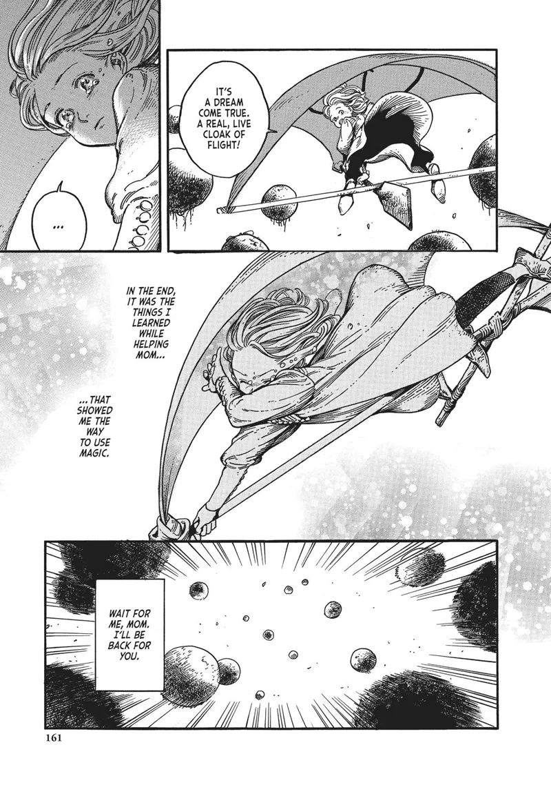 可可这才想起基弗雷在目睹她作为裁缝的技艺时对她的称赞。 “这就是真正的魔力,”Quifre 说道,她指的是Coco 熟练地裁剪布料时稳定的双手。可可用她的干斗篷当做帆,用扁平的石头和有限的魔法墨水在上面雕刻出元素符文(风)。当她仿佛穿着“一件活生生的飞行斗篷”一样奇迹般地跳到山顶时,可可流下了眼泪,意识到她母亲传授的艺术技巧最终为她铺平了魔法之路。 “等我,妈妈。我会回来找你的。”可可飞到空中时,一边发誓,一边用力地拔着冠草。