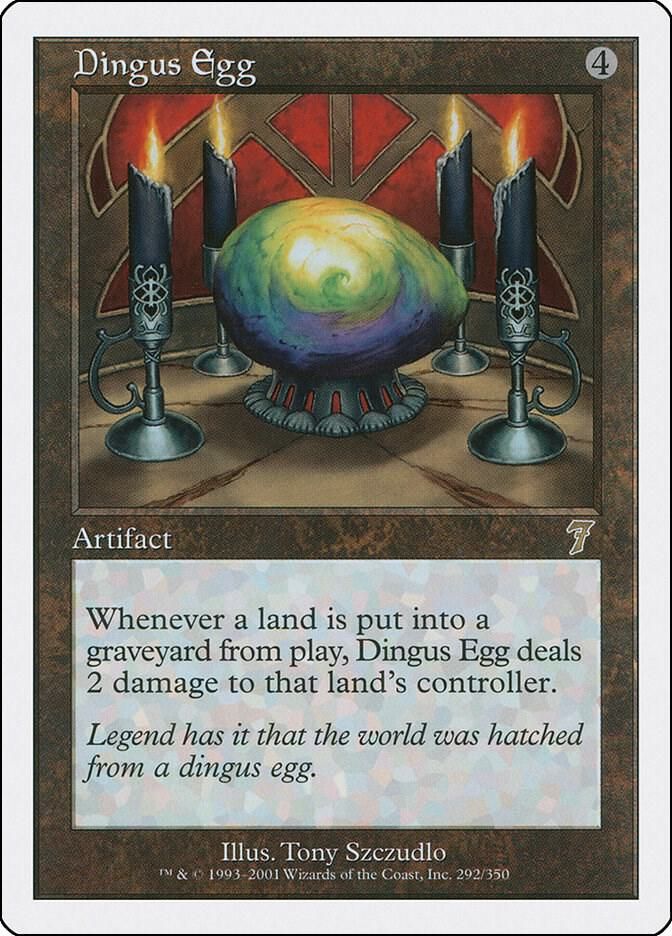 《Seventh》 还有一些伟大的“痛苦之地”可以横置并支付1 点生命来产生两种颜色之一的法力,或者在不支付生命的情况下产生无色法力。根据MTG Decks 的说法,这张五张双色地循环是该系列中指挥官格式中最受欢迎的卡牌之一。还有“黄铜之城”和高风险的红色即时“最终命运”,在当前回合—— 后为您提供额外回合,但除非您先击败对手,否则您将在该回合结束时输掉比赛。该卡片的插图描绘了一位骑士即将对一个看起来像杰夫·高布伦的家伙给予致命一击,后者正在翻找装满金币的宝箱。