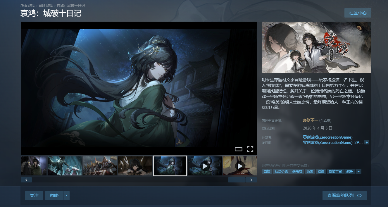 4月11日消息,国产独立游戏《哀鸿:城破十日记》自2026年4月3日正式发售以来,或者众筹开始以来,经常引发争议,而游戏发售后更是一发不可收拾。昨天,零创游戏正式公布了游戏首周销量数据,并同时发出了道歉信。